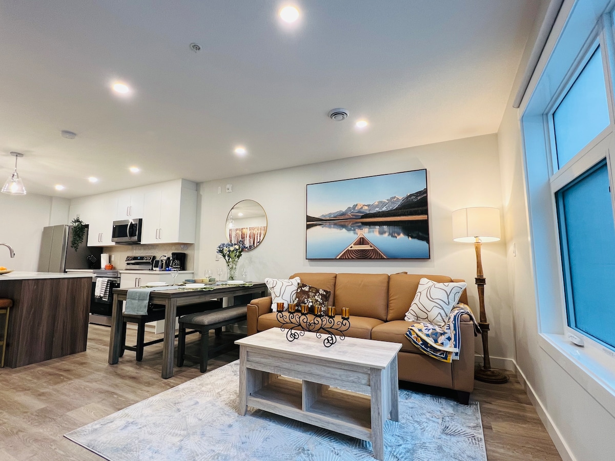 We pay the 15% Airbnb Service Fee for you! This newly constructed top-floor suite offers an exceptional living experience with breathtaking mountain views. Enjoy premium amenities like the communal rooftop hot tubs or the custom-built wet sauna. Host a BBQ and unwind on your two expansive private balconies. As night falls, gather around the fire table and marvel at the starry skies. Just a short drive from Banff, this property blends luxury and convenience for the ideal mountain getaway.