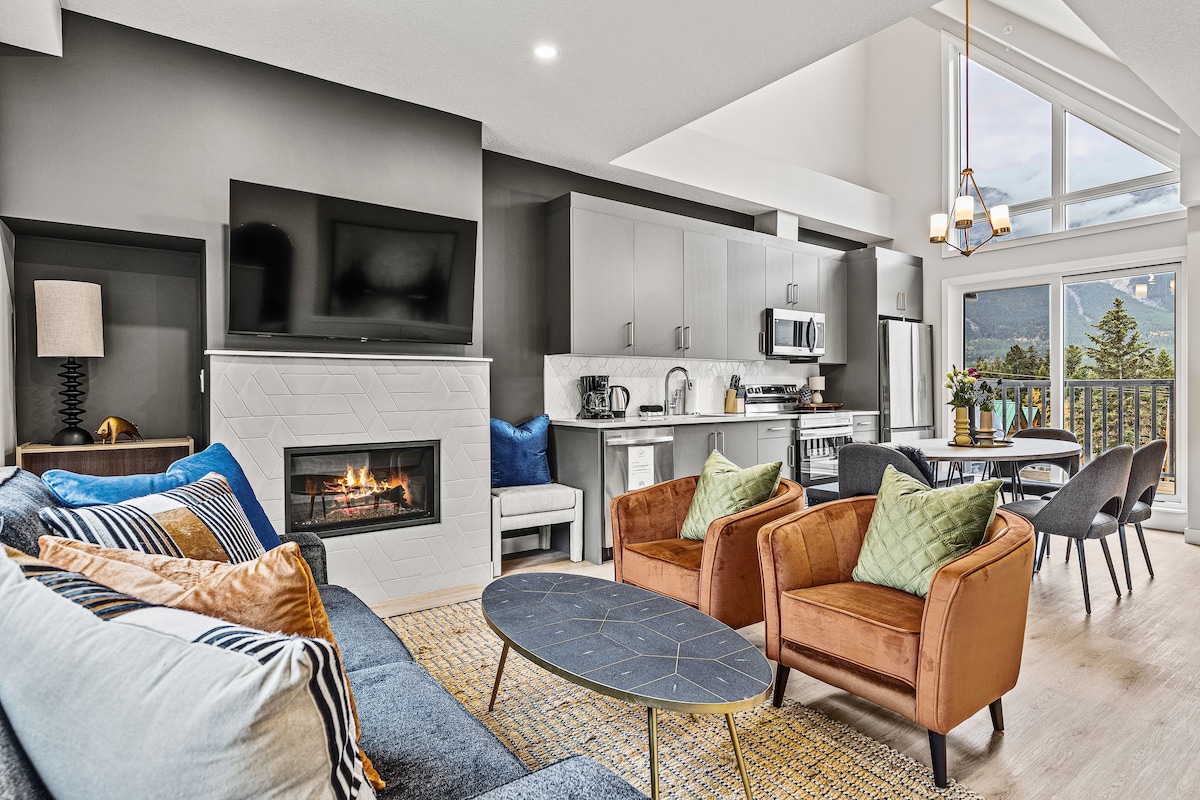 This newly constructed top-floor suite offers an exceptional living experience with breathtaking mountain views. Enjoy premium amenities like the communal rooftop hot tubs or the custom-built wet sauna. Host a BBQ and unwind on your two expansive private balconies. As night falls, gather around the fire table and marvel at the starry skies. Just a short drive from Banff, this property blends luxury and convenience for the ideal mountain getaway.