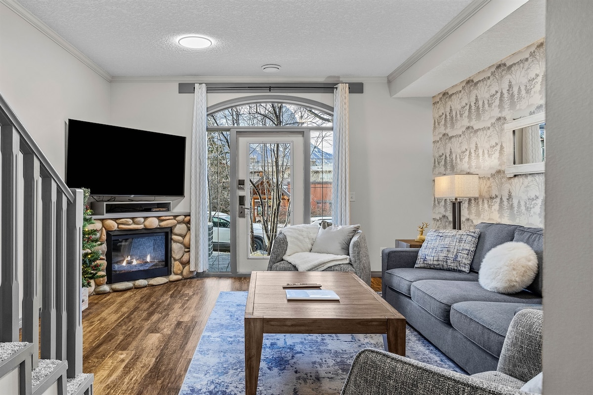 This modern rustic two-storey townhouse is nested around towering pines and conveniently located between Banff National Park & Canmore. What Makes our 2 BR Unit Standout: - TV in every room, two 60 inch Smart TVs with Netflix and Disney + - 2 full baths Other Features - 5 minutes to Banff gate and Canmore town centre - Free high speed WiFi for remote work - Full kitchen - In-suite laundry - Communal BBQ - AC - Beddings and towels Enjoy the spectacular mountain view from the balcony!