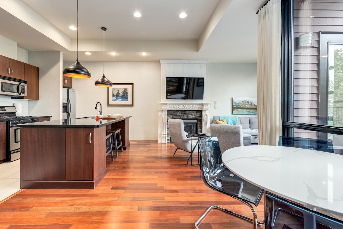 Indulge in a 5-star resort and stay at this luxurious Penthouse mountain suite with endless sunset views from every room. Decorated in the Hygge style and enhanced with exotic art, this premium suite offers high ceilings, cozy fireplaces, Smart TVs, and a spa-like, relaxing ambiance. Heated parking, in-unit washer/dryer, and high-speed Wi-Fi are included in your stay. Access to the gym and pools is included. Elevator is working.