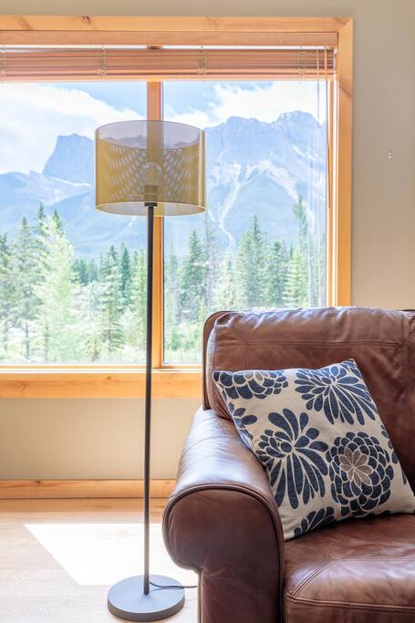 TOP FLOOR & PRIVATE. Fully disinfected prior to your stay. Exceptionally clean, see reviews. New linens & smallwares Large deck with BBQ & seating area with stunning views of the Rocky Mountains. Outdoor Chaise lounge x2 Tastefully decorated. Fully equipped kitchen. Bedroom has luxurious King Bed. Living room has sofa & large ottoman. Bathroom has Soaker Tub. TV/Wifi. In-suite Washer/Dryer Shared Pool, Hot Tub, Gym, Secure Parkade. Easy walk to town. Convenience store is nearby (5 min walk)