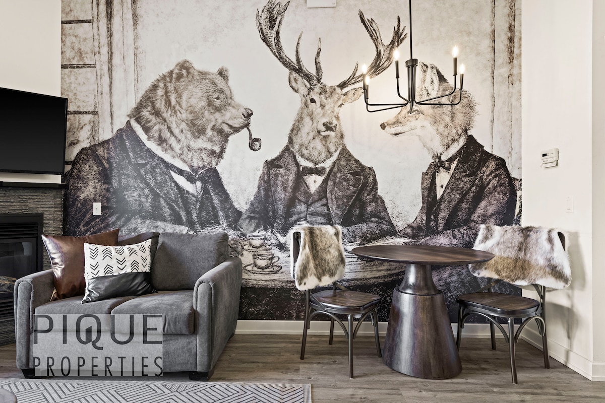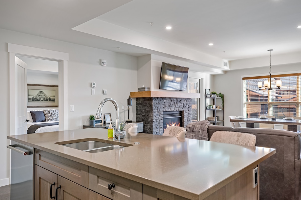 Blue Moose is a newly updated and furnished, spacious luxury one-bedroom condominium with king -sized bed and queen sofa bed. New for 2025: major bathroom and kitchen upgrades. PERFECT LOCATION This modern mountain retreat is situated next to a pristine mountain creek. Follow a creekside nature trail and within minutes you are in downtown Canmore with trendy shops, cafes, food trucks, and both casual and upscale dining.