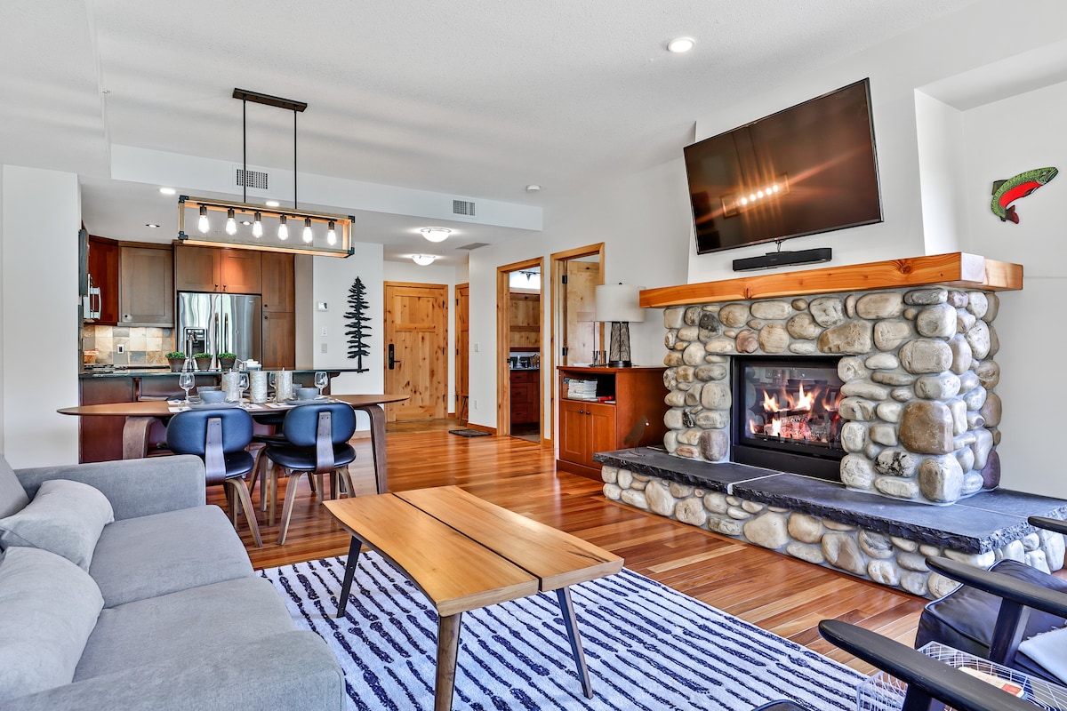 This 1700 Sq ft two bedroom, luxury condo features everything you need in a home away from home. Enjoy a beautiful open kitchen, huge fireplace and vaulted ceilings that show off breathtaking, panoramic mountain views! Outside your condo are walking trails, coffee shops, grocery, restaurants and more. This vacation spot is ideal for couples, families, and groups looking for the ultimate home base to explore the Canadian Rockies.