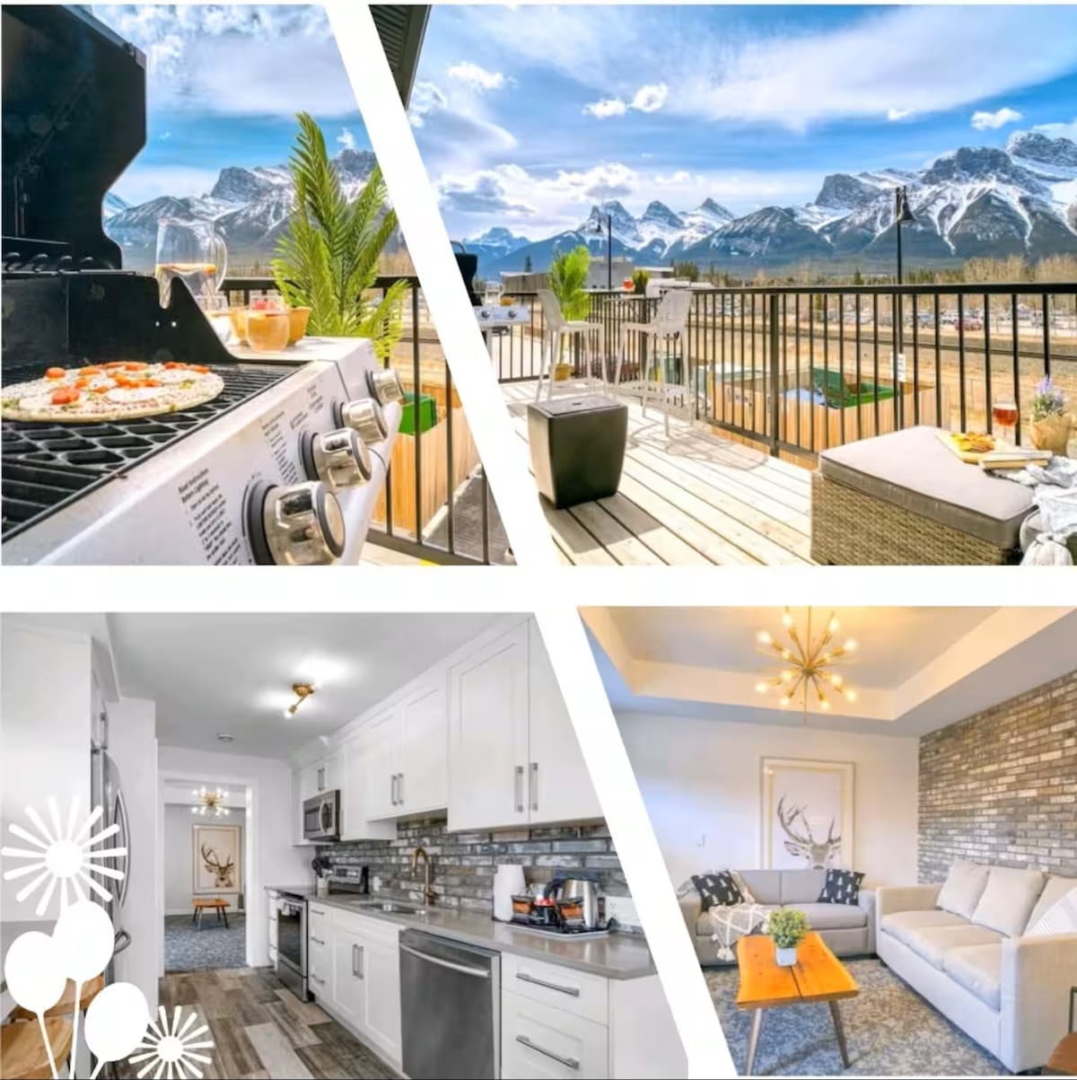 New, air conditioned, and beautifully furnished, top-of-the line Canmore Townhouse. A perfect destination for a luxury mountain retreat. The high end finishes, stainless steel appliances, stone counter tops, and open concept living space are perfect for large groups. Incredible views of the Three Sisters, and Rundle Mountain range from the living room/ deck. You won't want to leave. Walking distance to downtown and groceries (7min) and steps from coffee shops and restaurants. Free parking.