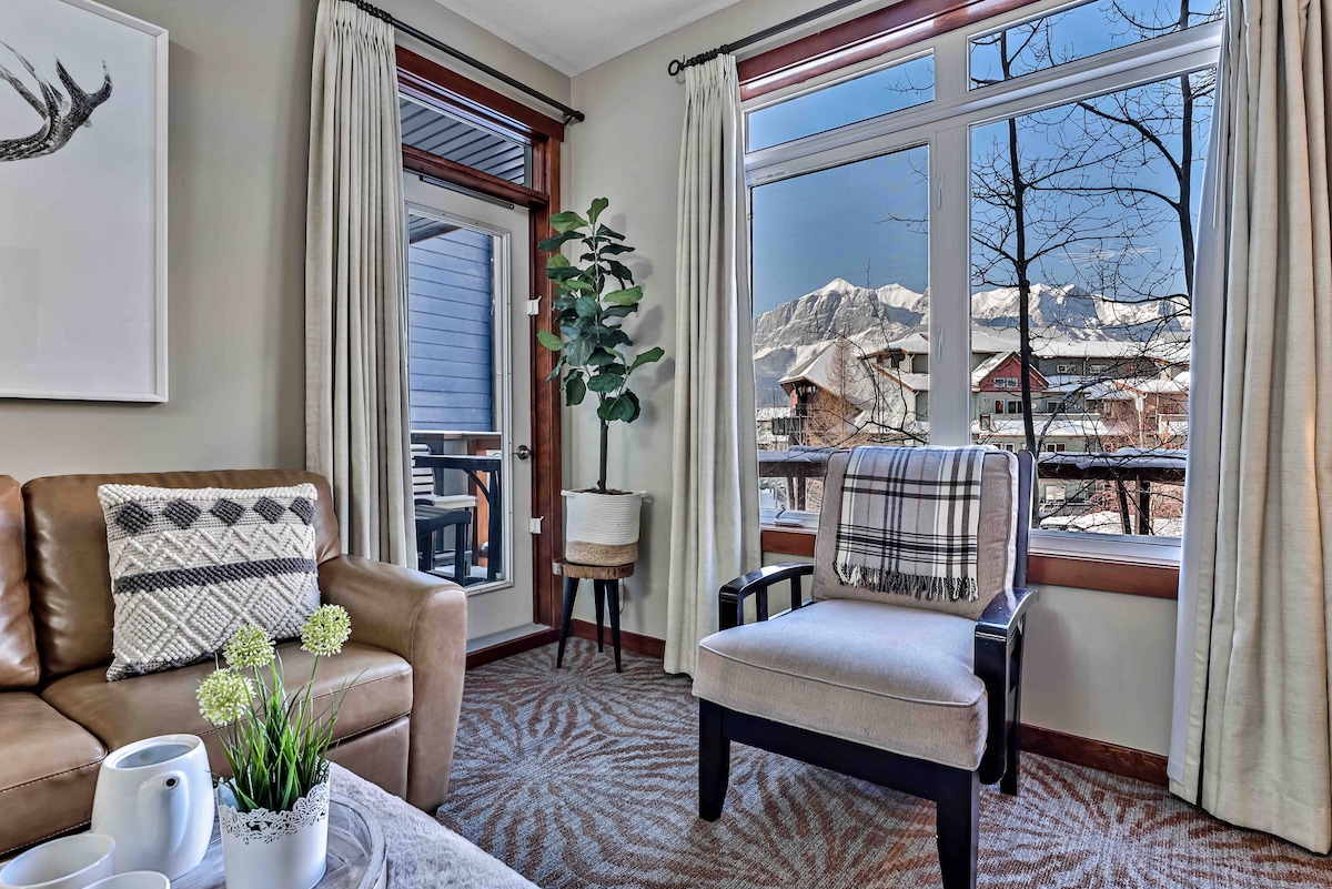 Escape to The Rundle Rock Retreat, a luxurious one-bedroom condo with spectacular mountain views. Indulge in a fully equipped kitchen with stainless steel appliances, and a spacious bedroom with a king bed, electric fireplace, and TV. The ensuite features a spa-inspired shower/tub, the living room is beautifully furnished with another fireplace and smart TV. Features cork flooring, a pullout bed, and access to a pool, hot tub, and gym. Pet-friendly too!