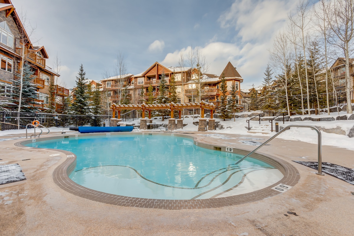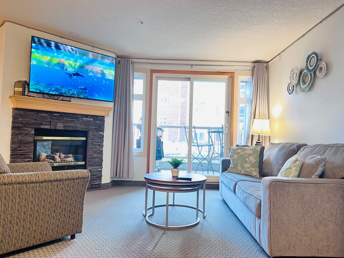Our condo with a walk-out patio is located in one of Canmore's top resorts. We have access to the resorts year-round heated pool, hot tub & fitness centre. We provide a fully appointed kitchen so you have everything you need to cook all your meals from home. With a brand-new king -sized mattress, you will get the beauty rest you deserve. We are a 15minute walk to beautiful downtown Canmore via Spring Creek, don’t forget to grab a coffee at the Black Dog Café to start your adventure off right!