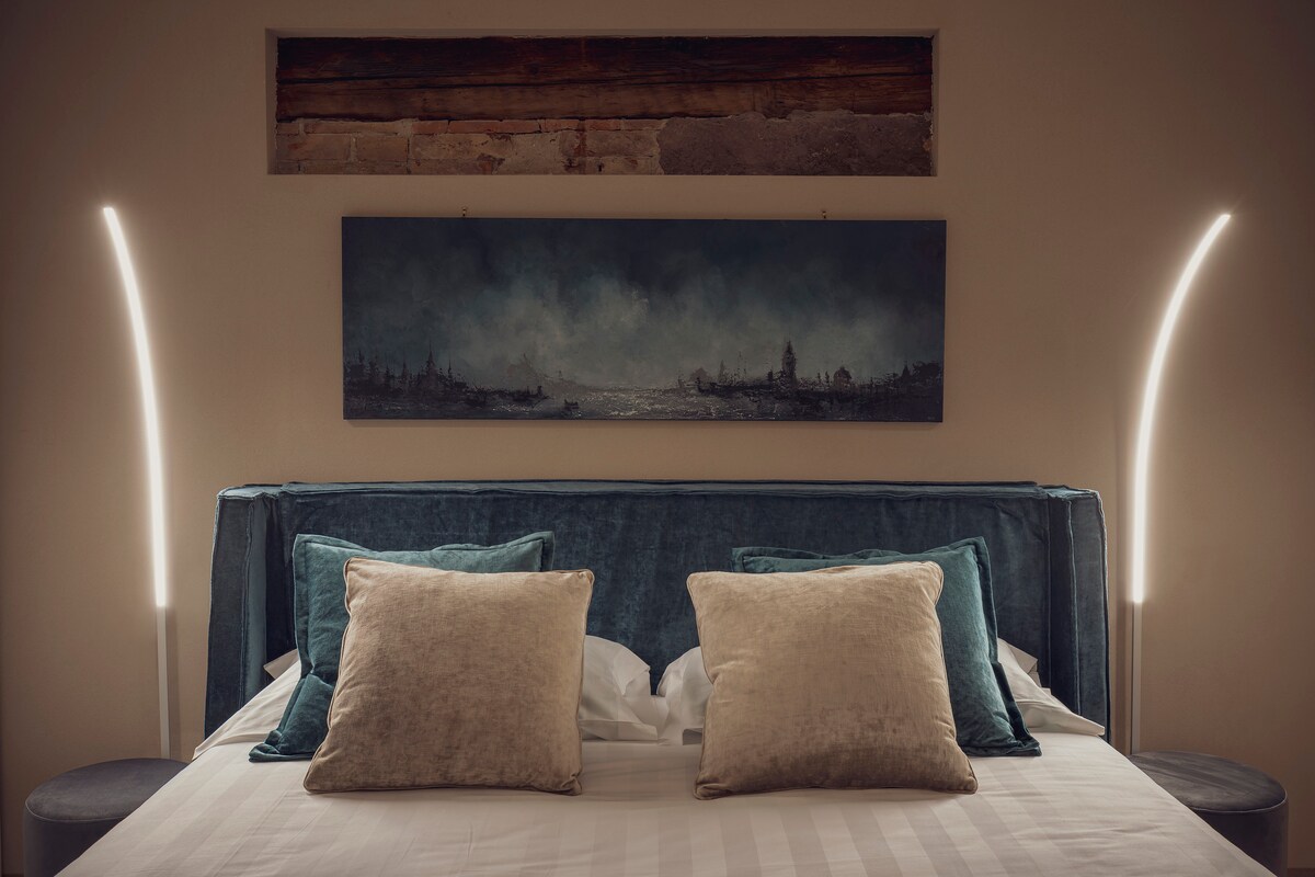 MURANO Suites - RUBINO, 70sqm of exclusivity. On the first floor, overlooking the Grand Canal of Murano with a striking view from a royal arched window that conveys the feeling of sleeping in the water. Great brightness given by 4 dormers installed in the exposed wooden roof. In the center, a two-sided fireplace divides the sleeping area from the living area, a particular situation that is probably unique in its context.