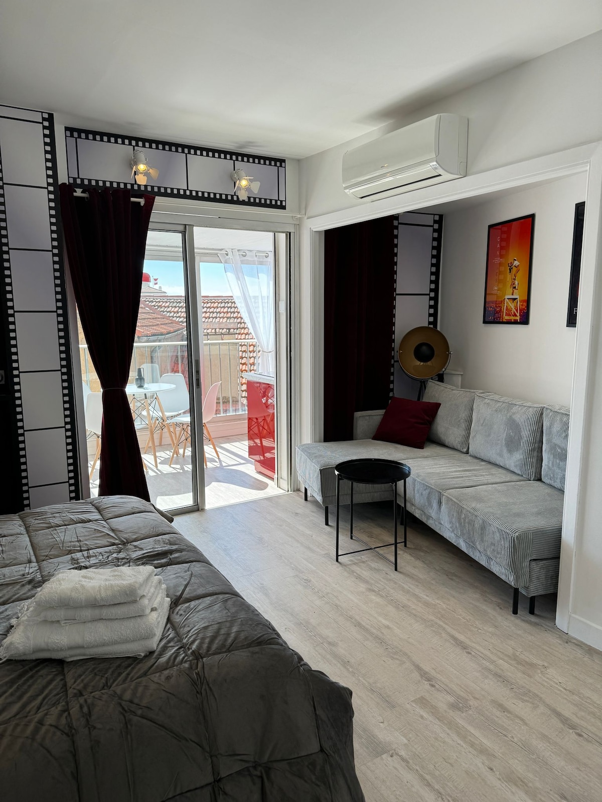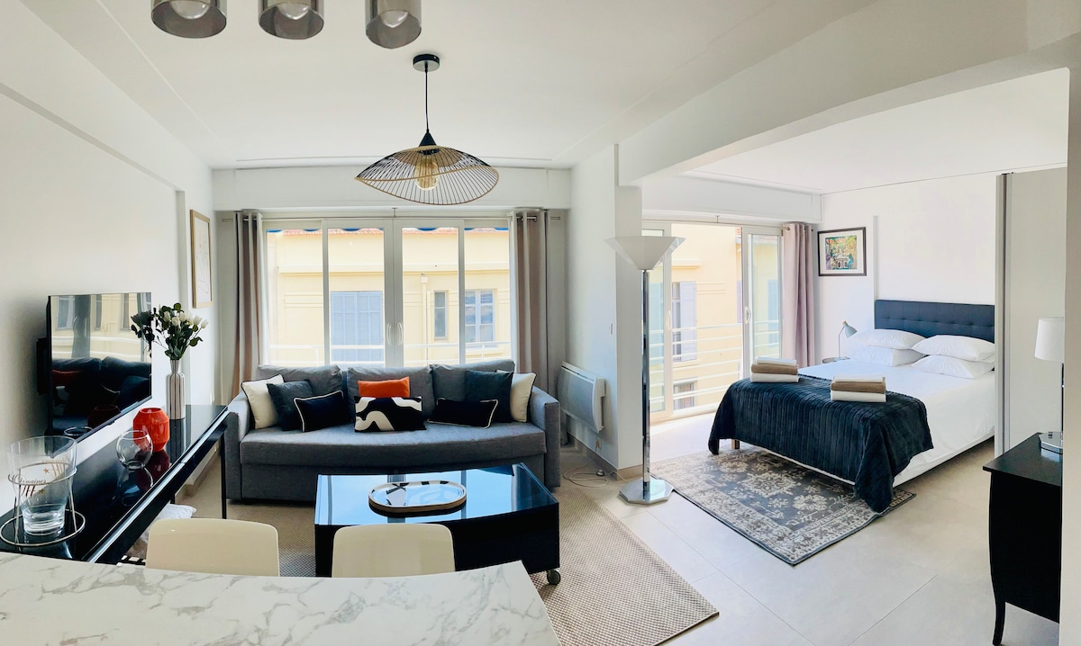 Architect-designed, 4-star sea-view apartment in the heart of Cannes, balcony overlooking the famous Félix Faure street. ✨Prime location: opposite the Palais des Festivals, port, beaches and the Croisette, just 2 min’ walk👣 🛍Surrounded by shops & restaurants 🛏1 bedroom (king-size bed) + premium sofa bed 🚿 1 shower room 🛜High-speed WiFi, Smart TV, Netflix, air conditioning, fully equipped kitchen (Nespresso), hair dryer, iron 🛁Bed linen, towels, soap, shampoo, coffee & tea provided 🔑