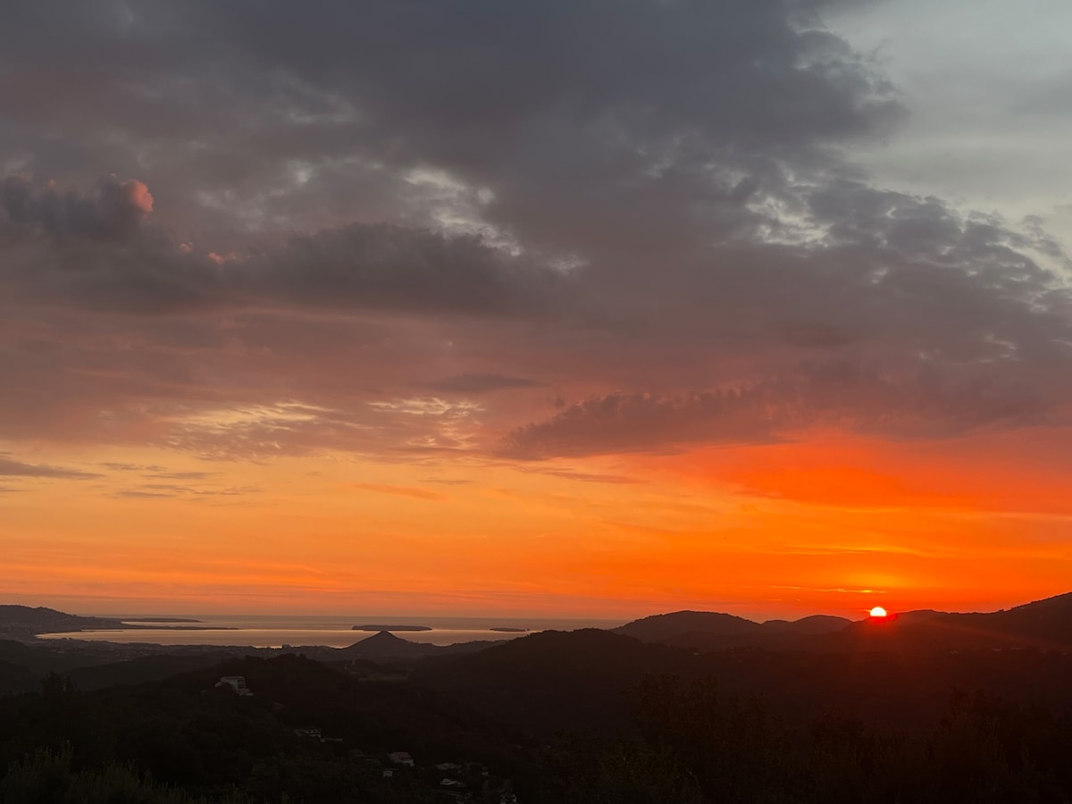 Our villa is located just outside the village of "Les Adrets de l'Esterel" on top of a hill in a private domain. We have magnificent views of the sea and mountains from our terrace and it overlooks the bay of Cannes where you can see the "Îles de Lerins". You will stay in our recently renovated apartment located on the garden level of our villa with your own private access and terrace. Stairs lead directly to the pool above. The pool is shared with us.
