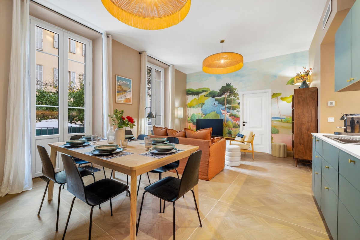 Profitez d'un logement élégant et central. Il est parfaitement situé offre un accès facile à tous les sites et commodités. Palais des Festivals, Plages, Restaurants, Bars, Discothèques, Casinos, Boulangeries, Alimentations...etc...vous pouvez tout faire à pied dans un rayon de 300m, 2mn de la gare SNCF Avec sa terrasse de 6 m2 vous profiterez pleinement de votre séjour à Cannes. • 1ème étage sans ascenseur • Climatisation • Wifi