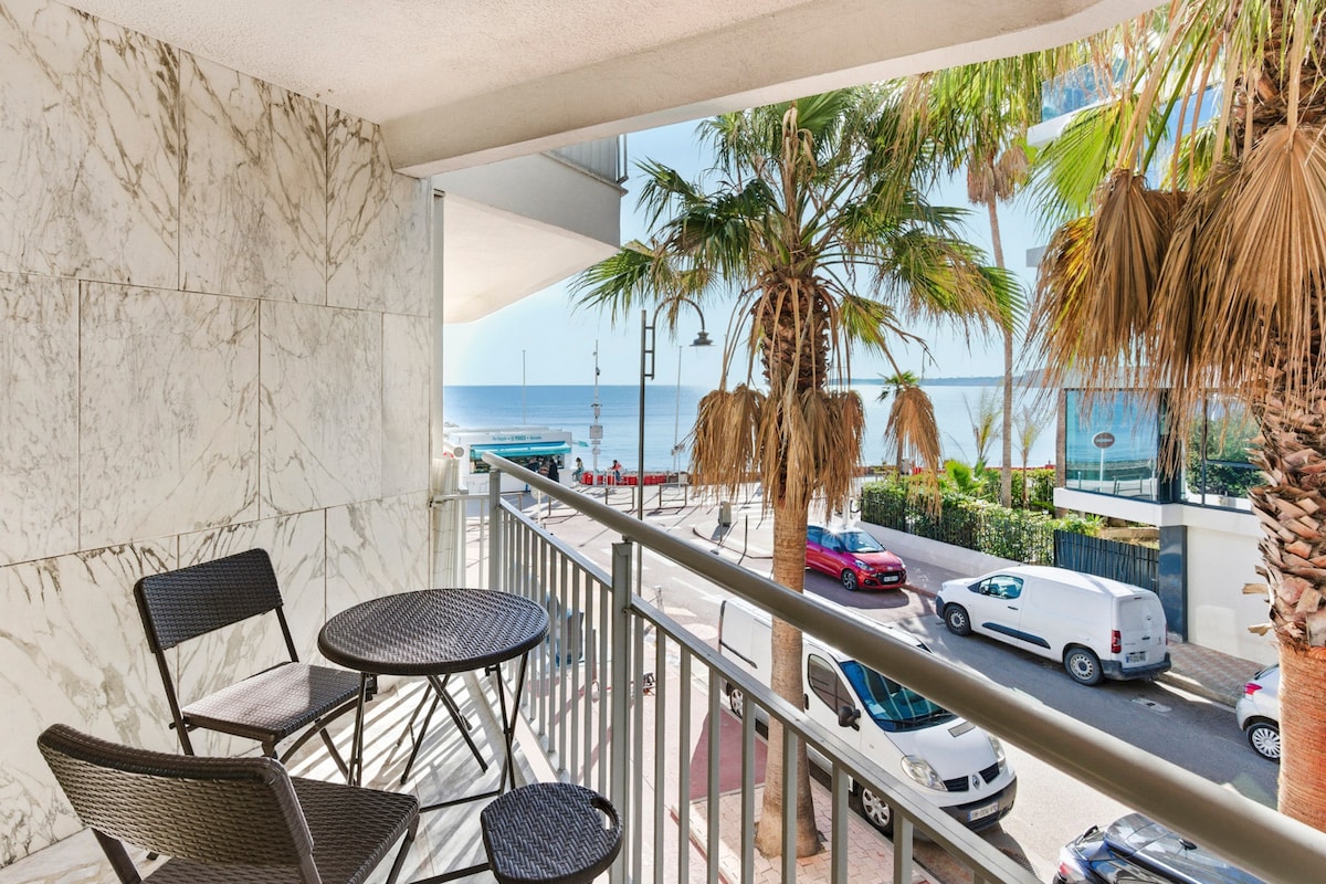 Palm Nest Cannes: Plage Gazagnaire is right at your doorstep. Located in Palm Beach, enjoy sea views from the terrace, living room, and bedroom. The street opens directly to the Croisette, with the center a pleasant walk away. The Panoramic Bus is 1 min away. Convenience is key: a fabulous bakery is in the building, plus grocery stores and a pharmacy right next door. Indulge in 5-star bedding and premium amenities. A sophisticated, quiet sanctuary in the city's most prestigious residential area.