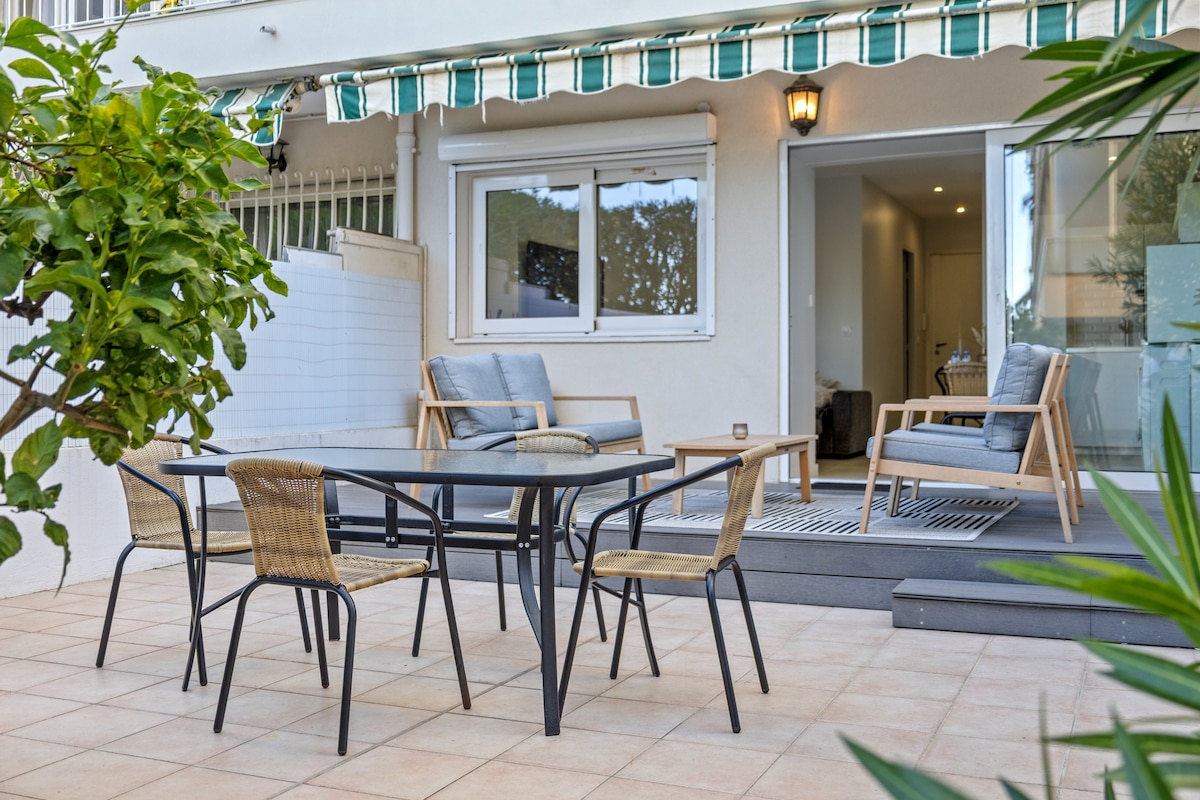 Perfectly located bourgeois apartment in an elegant 1900s villa. Terrace with beautiful view of the park with palm trees. Shared pool. Parking. Gated. Large living room and kitchen with high ceilings. French doors opens onto the terrace. 2 spacious bedrooms with king beds (180). 2 bathrooms with shower. Sleeping sofa for 2 in living room (140). Apartment is in the city center with walking distance to everything. Buss 30m, Grocery 100m, Beach 300m, Old Town 500m, Palais de Festival 1000m.