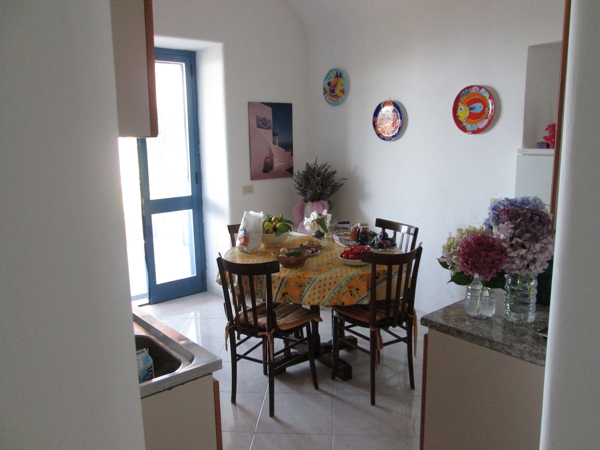 Our holiday home is on the 2nd floor, It consists of a kitchen / living room with a sofa-bed for one and a half, a bedroom and a bathroom with shower, as well as 2 large covered terraces with sea view and it can accommodate 2 to 4 people; The terraces are both equipped with tables and chairs for outdoor dining, there is a barbecue and a sun terrace with sun loungers.