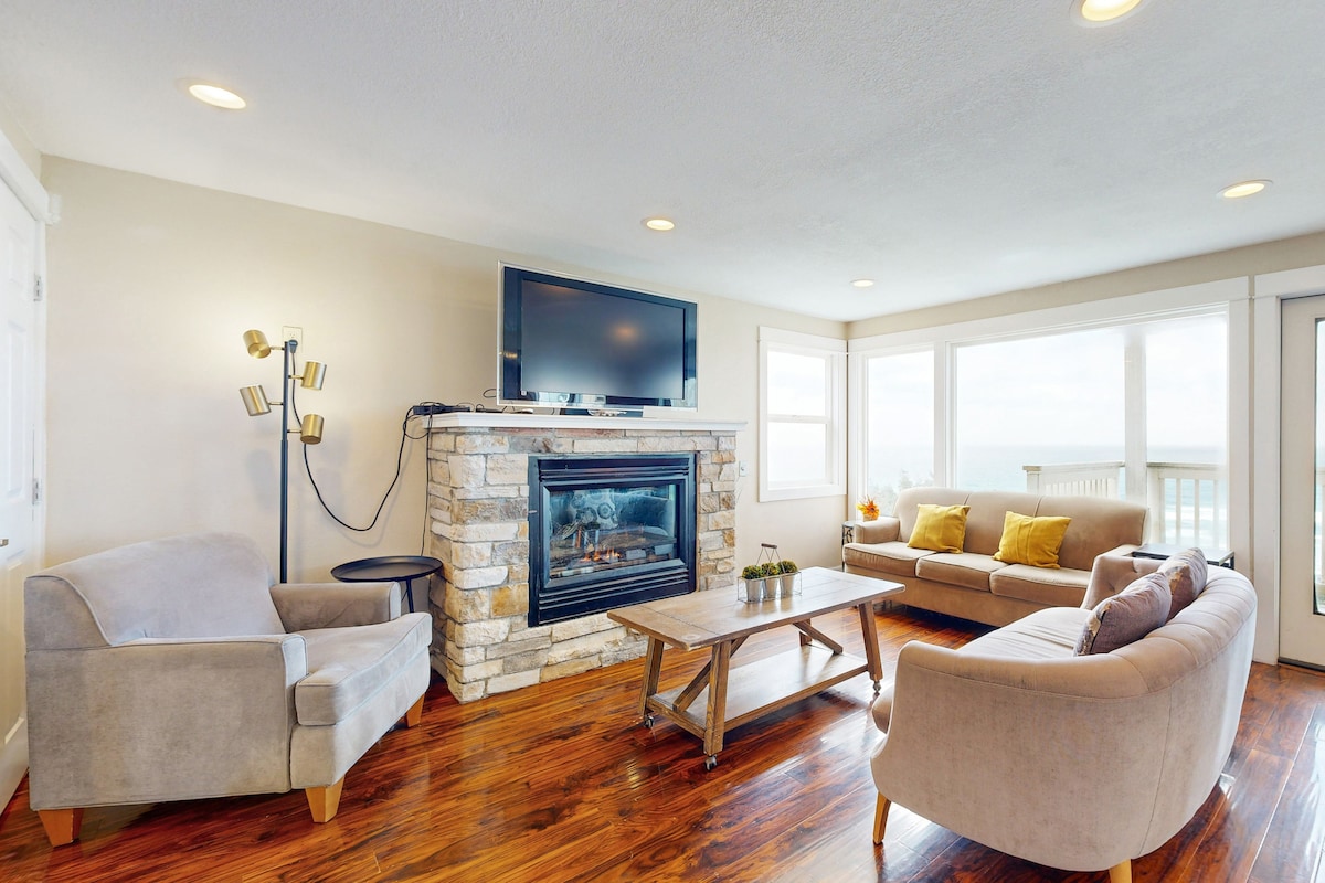 Enjoy expansive views of Pacific Ocean waves beautifully crashing on Rockaway Beach. The oceanfront location provides easy access to 7 miles of sandy beach. The euro style kitchen is for your use or choose a local eatery. Weather inclement: grab a great wine; dim the lights; turn on the beautiful electric fireplace; and, enjoy the 55" 4K Home Theater system and 5.1 Doby Atmos soundbar. Using WiFi stream your content from your device to the 4K Home Theater. The soundbar is BT enabled.