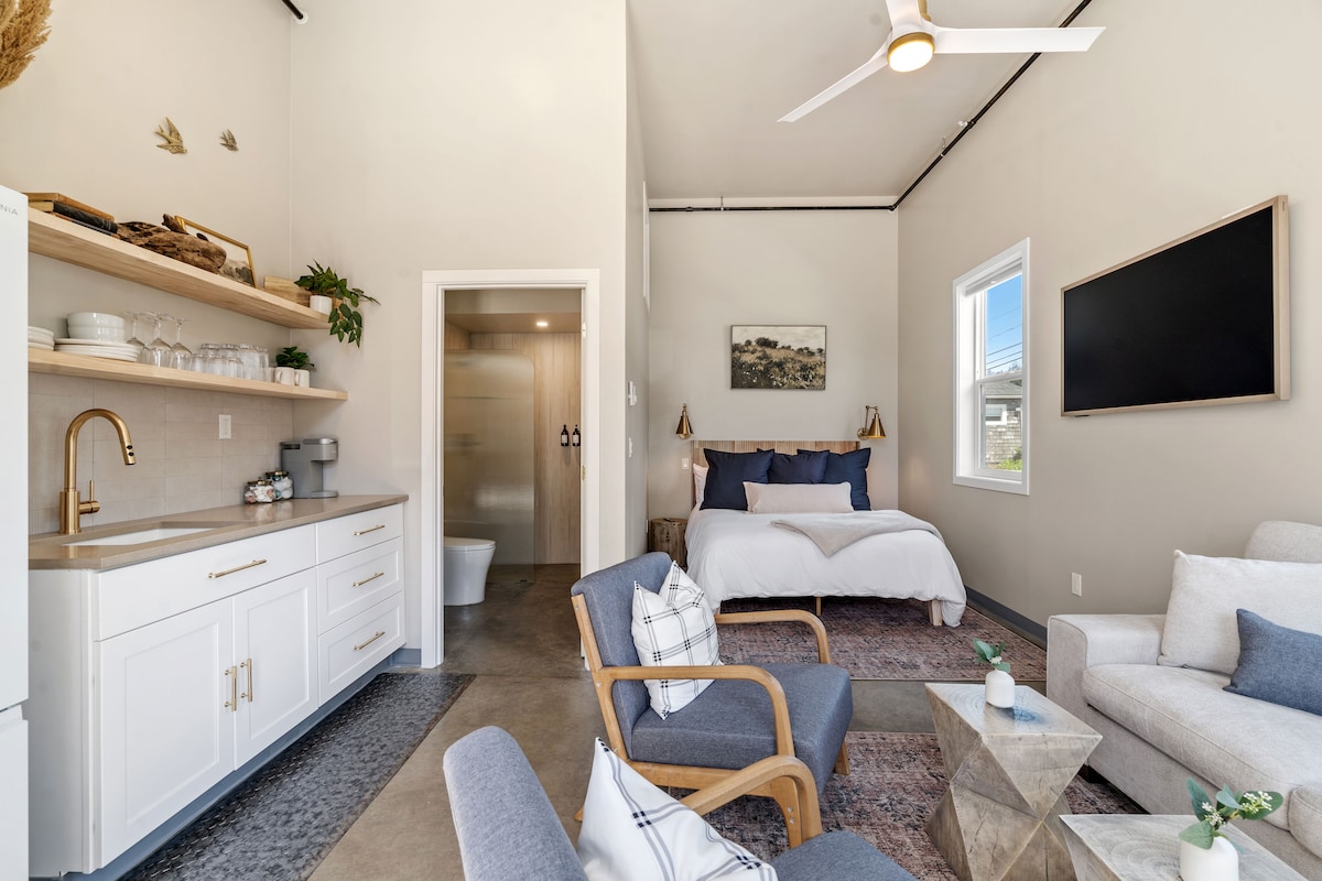 Puffin Place is a 320 sqft studio located two streets from the beach. Walking distance to Fresh Foods grocery and multiple restaurants. Vaulted ceilings, large windows, and neutral tones make the space the perfect combination of bright and cozy. On chilly days, curl up next to the gas fireplace and stream your favorite shows. The queen bed sleeps two guests comfortably. The sofa twin beds are best suited to youngsters. The condo is a third floor unit with stairs, no elevator.