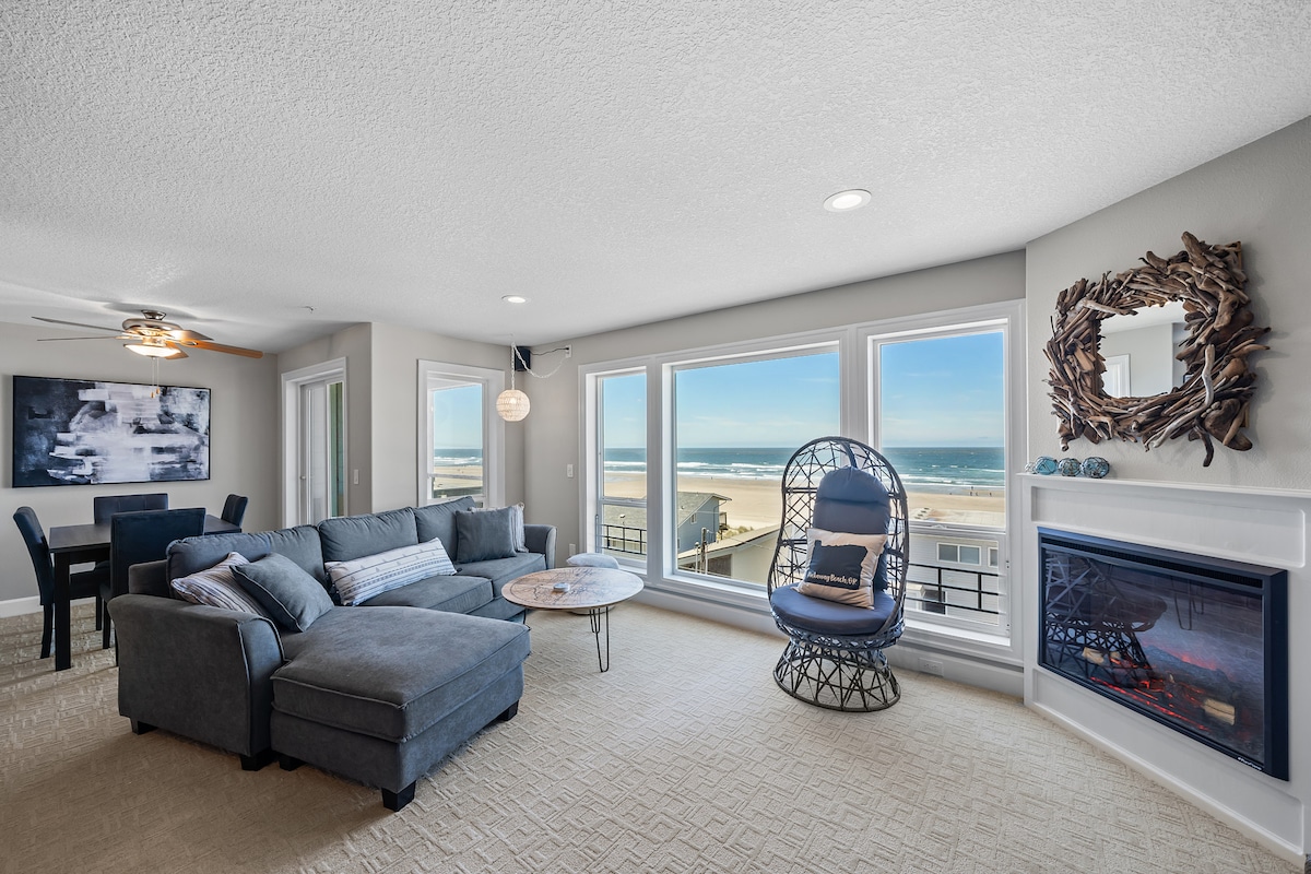 Like New SEASIDE OCEANFRONT Condo on the Promenade!Gorgeous Ocean View with Balcony! Open Living, Dining Room & Brand New Kitchen, Elec Fireplace, new furnishings, comfy new Queen sofa sleeper, Desk with computer, printer/scanner, new 60" TV's with cable, free Internet.WORK REMOTELY!Master Bedroom Suite has comfy new King Sleep Number mattress with it's own private remod bath with shower/tub combo.2nd Full Bath is remod & has shower!One of the nicest oceanfront in Seaside. See our 2nd floor unit