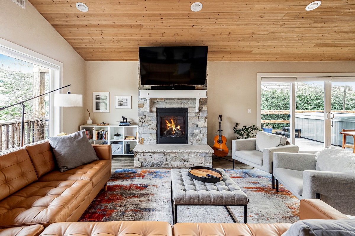 Swedish for "beach house", Strandhus embodies Scandinavian living, combining functionality with beauty in a light, airy space. Just steps from wild mushroom-filled forest trails and a 5-minute walk down a quiet road to the Pacific, Strandhus can be your relaxing getaway retreat or ignite your family’s sense of wonder. Highlights include a 6-person hot tub, sauna, large deck, vaulted ceilings with skylights, spacious living room & kitchen, ping pong table, gas fireplace, and EV charger.