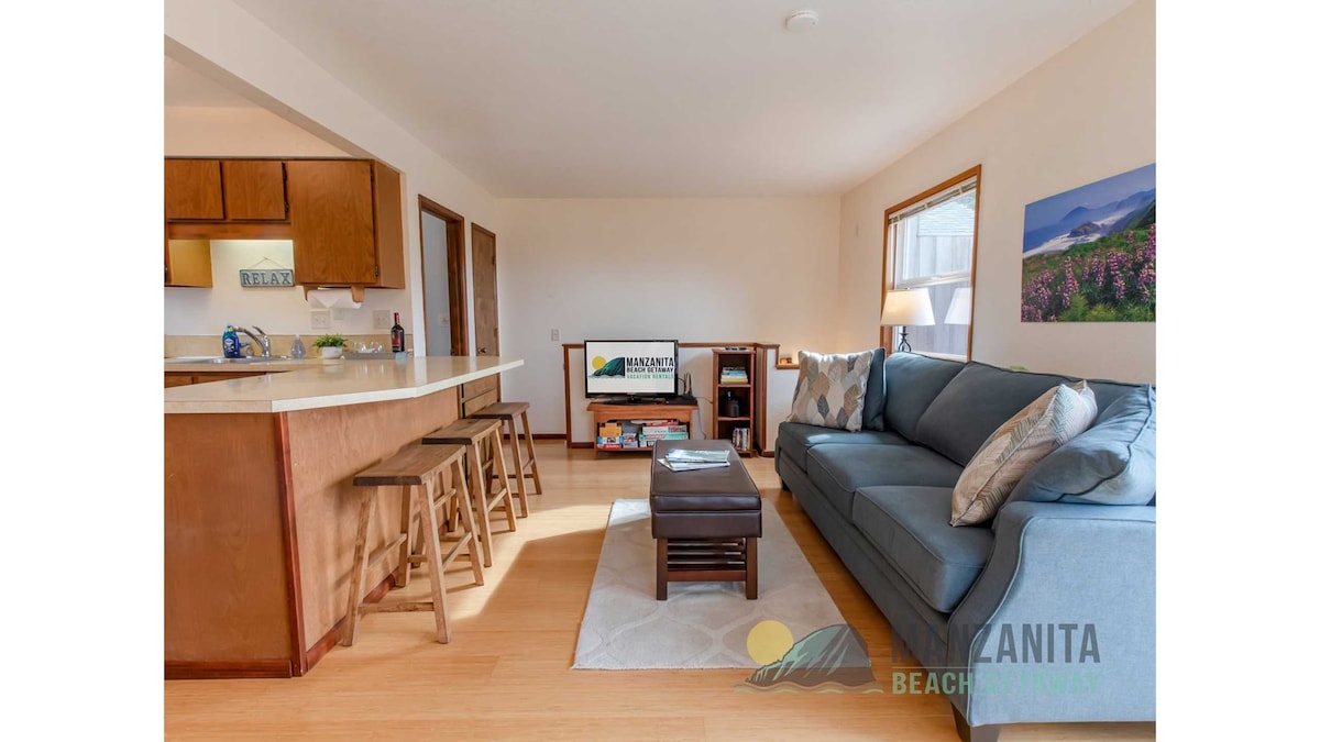 Sandcastle Unit B-4 - the perfect getaway for couples and families. 1.5 blocks to the beach, this remodeled, first floor, 2 bed-2 bath condo in south Cannon Beach is a quiet relaxing spot 2 miles from downtown. It includes a 1-car garage equipped with a FREE High Speed EV universal charger and a heated saltwater pool(community). It is next door to Fresh Foods Market and has plenty of amenities for kids. New king size medium firm mattress with a plush mattress topper and new leather premium couch