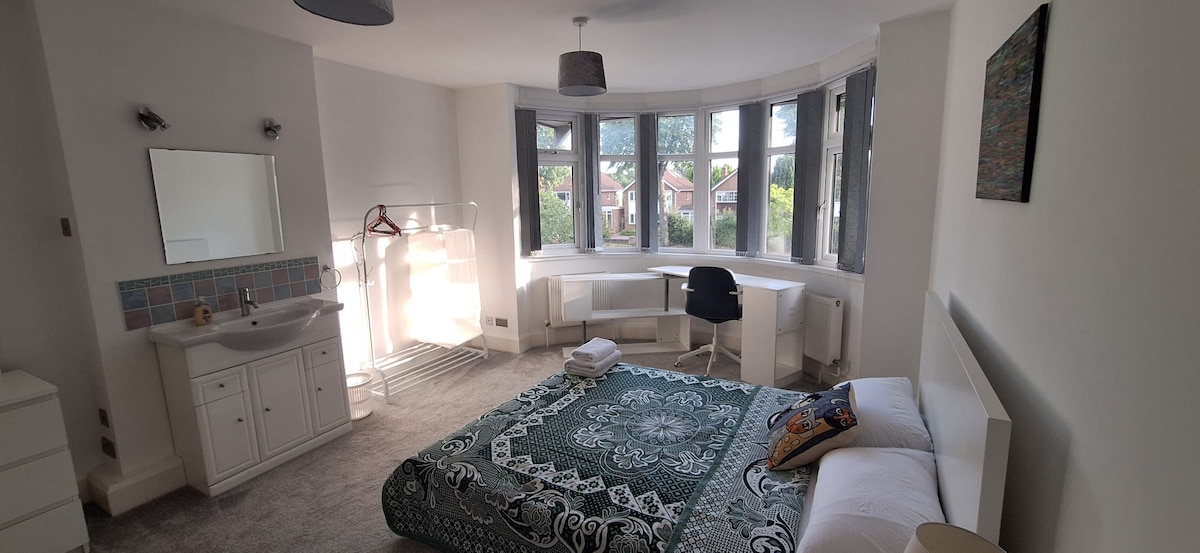Bright, self-contained annexe on the 1st floor with private entry and lockbox for easy check-in. Features a king-size bed, sofa bed, dining area, and kitchenette with fridge/freezer, toaster, and tea/coffee facilities (no hob/oven). Mezzanine with two single beds, accessed by stepladder with lockable gate. Modern ensuite with shower and fresh towels. 42” TV with Netflix (no terrestrial TV). Private parking for 2–3 cars. EV charger available on request for a fee.