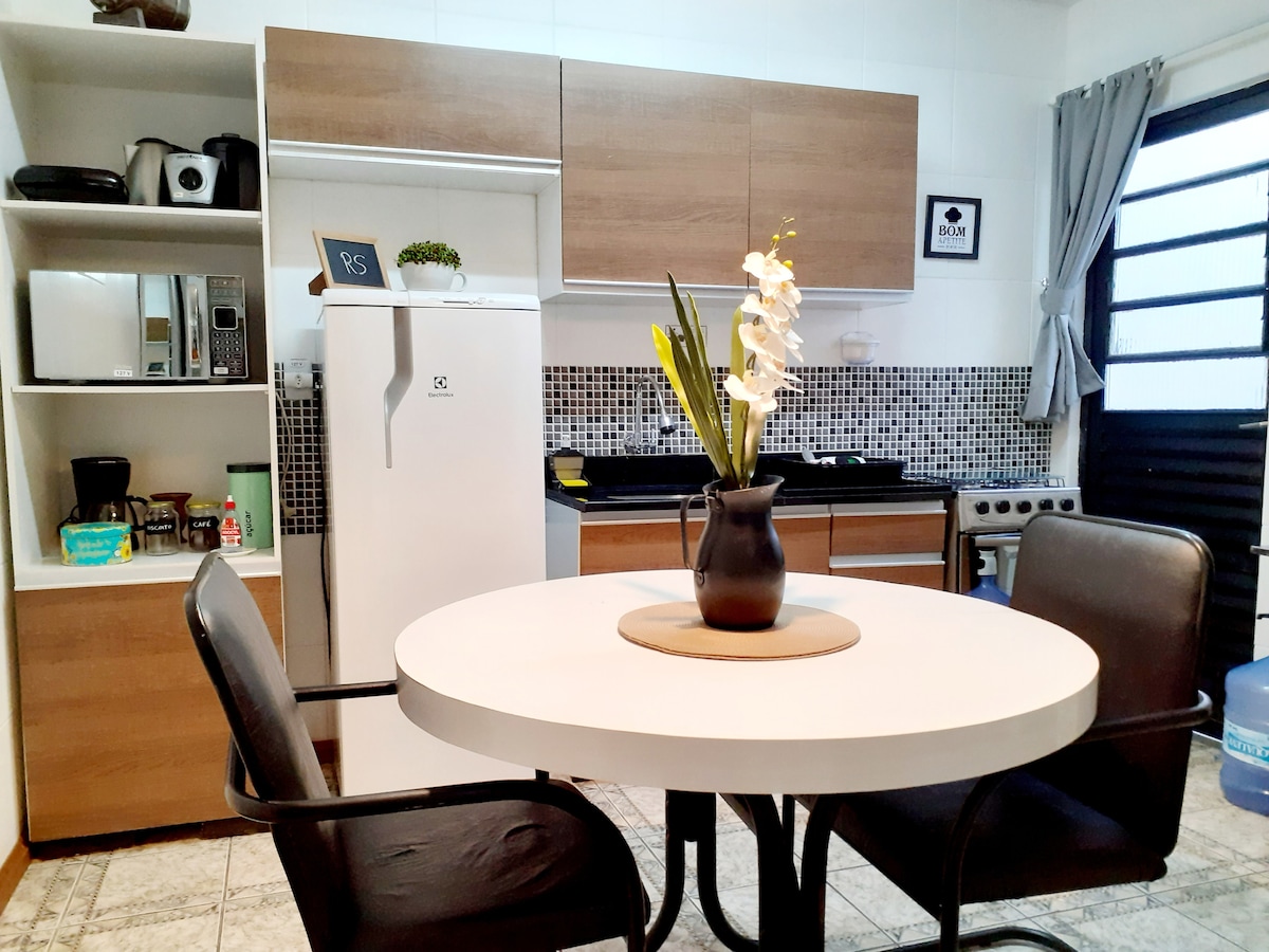 Desfrute de uma estadia confortável neste apartamento completo, ideal para estadias curtas. O espaço conta com: - Quarto com cama de casal, ar-condicionado e mesa de escritório. - Cozinha equipada com geladeira, fogão, utensílios básicos e alguns condimentos (sal, açúcar, café..). - Sala de estar com sofá e TV. - Banheiro com chuveiro elétrico e secador de cabelos. Além disso, o imóvel oferece: - Estacionamento descoberto com portão eletrônico e câmeras de segurança . - Lavanderia compartilhada.