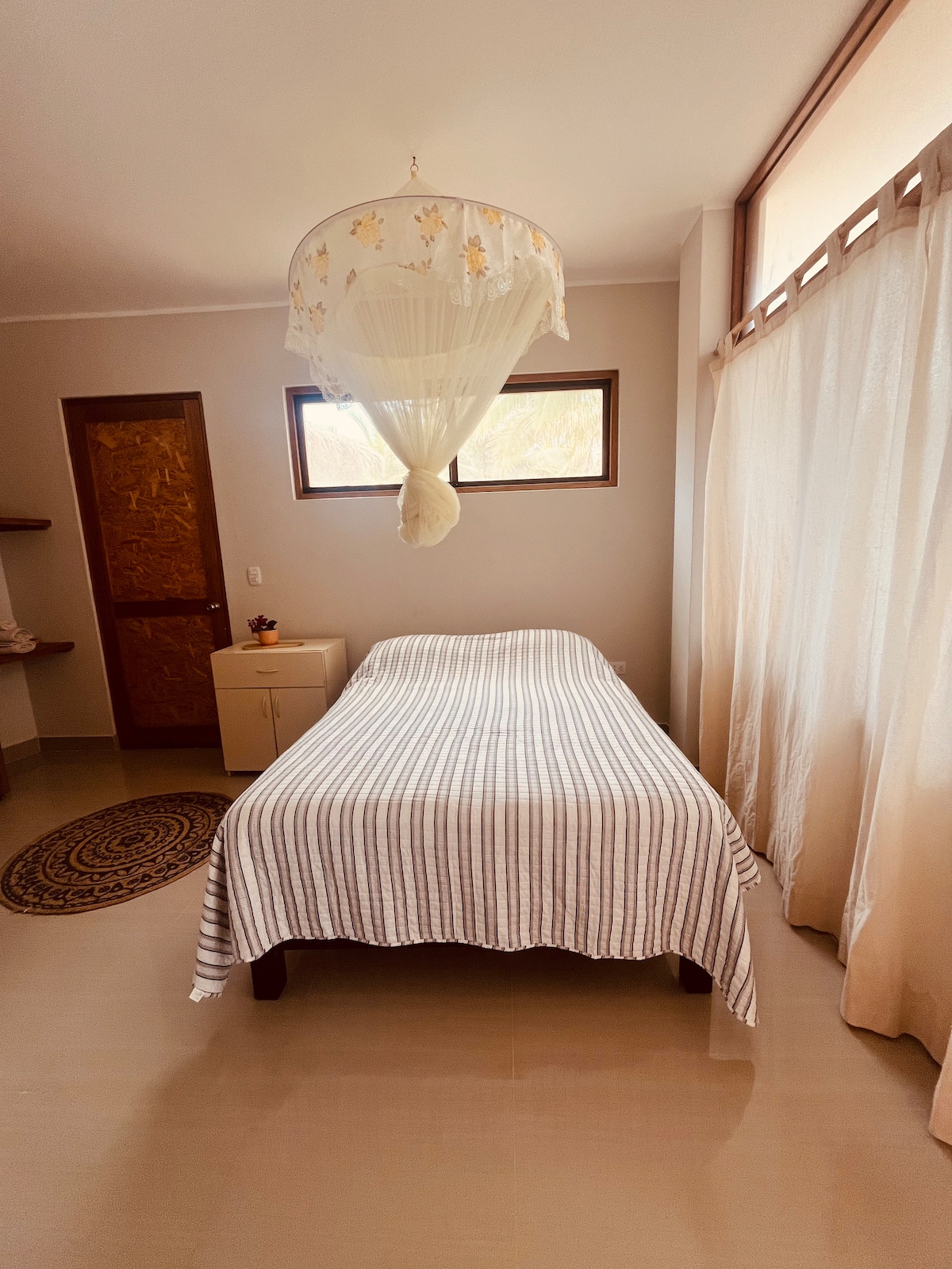 Acogedora Habitación para 2 personas ubicada en una tranquila calle en segunda fila, hay un ingreso a la playa a pocos pasos de la casa. Mancora es un lugar mágico con sol todo el año, donde encontrarás lo q buscas, desde relajarte frente al mar, lugares para hacer yoga y deportes acuáticos como el surf y el kite surf, una gran cantidad de opciones culinarias de todo precio, y una vida nocturna muy activa. Todo depende de lo que desees hacer todo en un pequeño pueblo frente al mar.