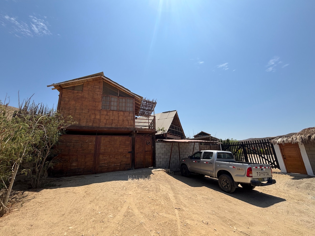 Conformada por 1 casa de playa a 45 mts del mar. El terreno está cercado y en primera fila. Desde 1 hasta 11 personas (4 habitaciones) construido con materiales del norte peruano caña, bambú y palma en un solo nivel terreno de 1600 m2 en un condominio privado. Relájate con el sonido del mar y disfruta de la orilla a unos metros de tu cama. Muy rústico, natural, confortable, simple, limpio y privado. El número de habitaciones disponibles, dependerá del número de huéspedes reservados.
