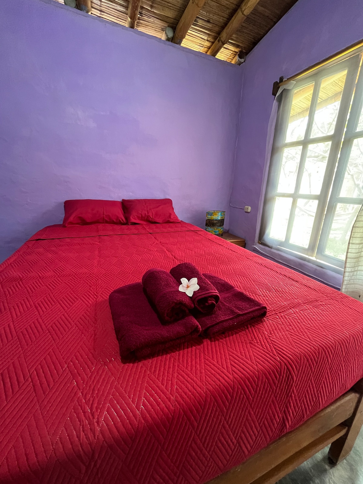 -Habitación de Hotel (12 m2),ubicado a 100mts o una cuadra de la playa en el centro de Máncora.- 01 Cama de 2 plazas, baño privado, ubicado en el primer piso.-Ventilador de pie, tiene su armario mediano con un colgador, mesas de noche , ventana con malla de mosquetero para evitar la entrada de insectos a su habitación y tiene vista al jardín y a la piscina del hotel, -no tiene vista a la playa.-no agua caliente.-puede haber bulla de afuera.