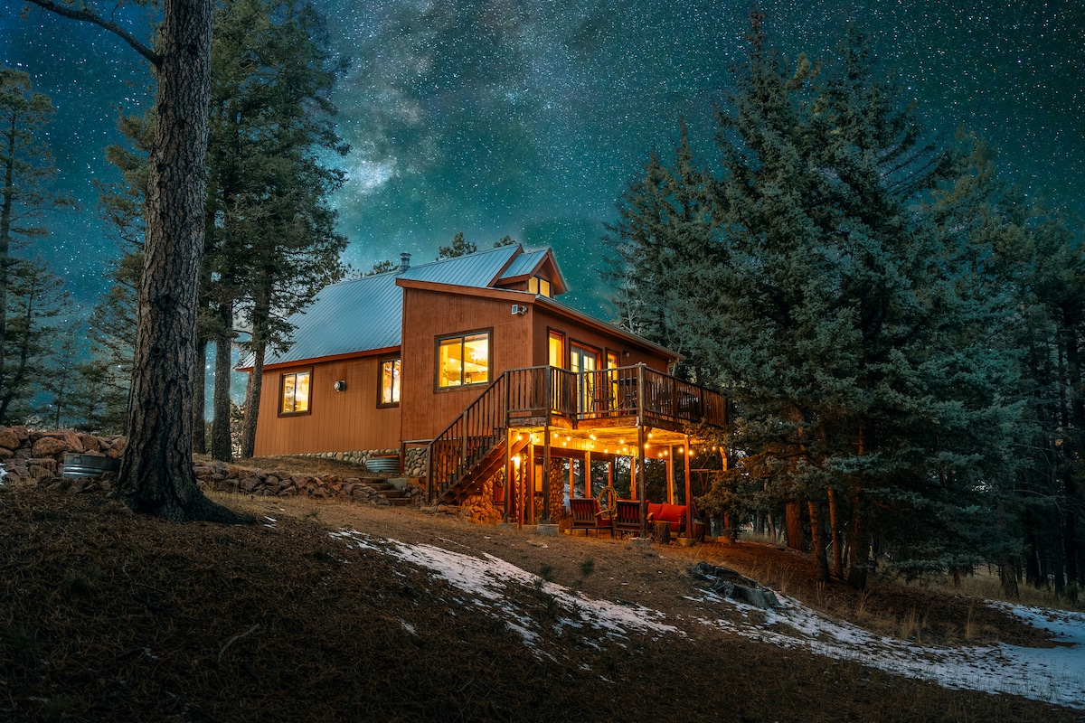 Retreat in the mountains of Colorado at this private two-bedroom, two-bath cabin with a steam sauna. Surrounded by Ponderosa Pines and Aspens in the beautiful Pikes Peak region, come unwind and recharge. This home is located in a nationally registered dark sky zone, and offers gorgeous mountain views from the porch. The cabin boasts an open living room, fully equipped kitchen, and inviting dining area. The space was designed and outfitted so you can enjoy all the comforts of your own home, while