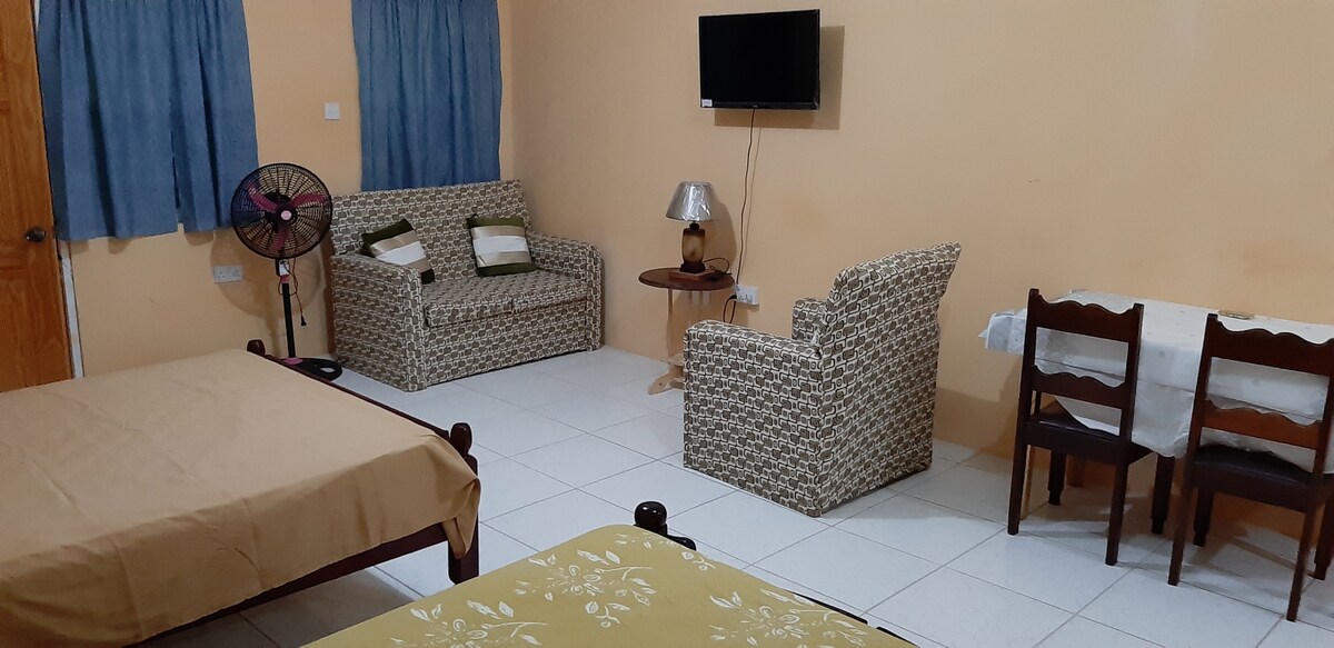 Our Studio apartments are ideally located in Tyrell Bay, Carriacou. Whether you want a place to explore our beautiful island from or you are working on your boat you'll find a comfortable spot 100 yards from the beach. We are a short walk from the port with easy access to transport to the rest of the island, with a range of bars and restaurants within walking distance. This is our ground floor apartment, accessible via a few steps at the front of the apartment.