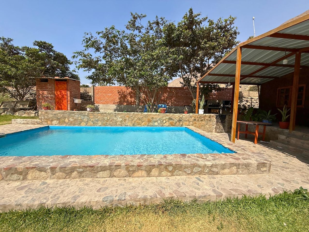 Relájate con toda la familia en la naturaleza en este tranquilo lugar a 1hr 30 min de lima con sol todo el año viviendo una experiencia distinta mira las estrellas en la noche y una copa de vino . No HAY Habitaciones -brindamos 2 carpas y 2 colchones -zona de parrilla -Horno Artesanal para pizza -Cocina y Refrigeradora - Menaje -Amplia mesa para 8 personas -Zona de terraza piscina con catarata -pet friendly -Baño completo -Brindo 2 toallas En caso desea adicionar personas escribeme