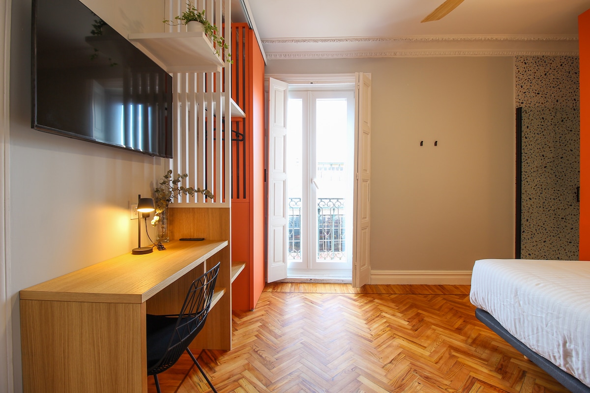 Habitación de uso individual. Dispone de cama individual de medidas 105x190cm, ademas de baño privado dentro de la habitación y vistas a una calle tranquila.