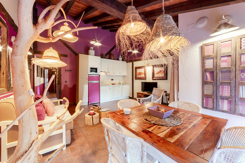 Apartamento de un dormitorio. Chimenea, jacuzzi doble y terraza con buenas vistas. Consta de salón con chimenea y cocina americana equipada con menaje y electrodomésticos. Dormitorio con cama de 150 y jacuzzi doble. Cuarto de baño. Capacidad 2 personas y posibilidad de 2 personas mas en sofá cama.