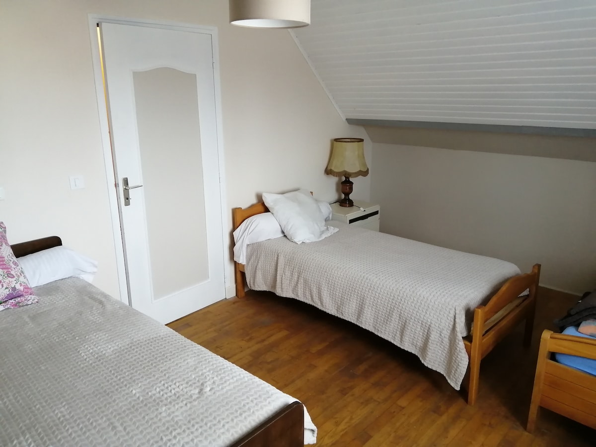 Chambres de 4 lits d'une place chez l'habitant situées à l'étage d' une grande maison avec salle de douche et wc commun aux deux chambres à louer. Situé au bout d'un petit lotissement sans vis a vis où vous pourrais aspirer au calme. Possibilité de petit dejeuner (5euros) frigo et micro onde a disposition. Accés direct pour randonnée pédestre dans les sentiers de l'imaginaire. A proximité (-5 km): Ranch équestre Ville médiévale Espace balnéo Sentier de l'imaginaire Marché Superette