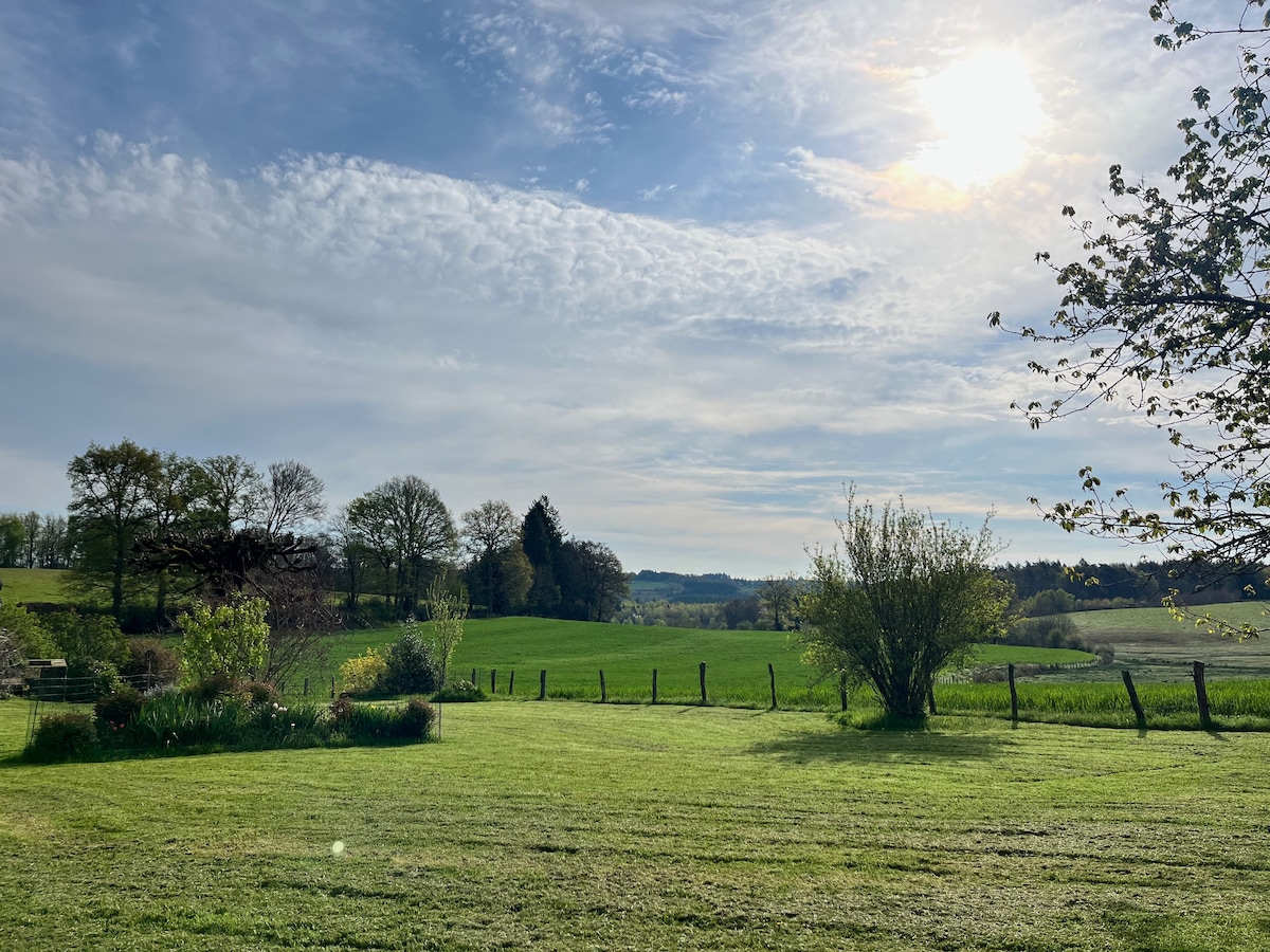 Warm and welcoming family home nestled in the heart of the Corrèze woods—perfect for a peaceful nature getaway. Spacious living area with traditional fireplace, equipped kitchen, screen and home cinema (bring your own projector). 4 bedrooms, 1 sofa bed, 2 bathrooms, 2 toilets. New bedding. Linen available for rent: €25/set. Horses help maintain the meadows part of the year, and our free-range chickens roam freely—please treat them with care.