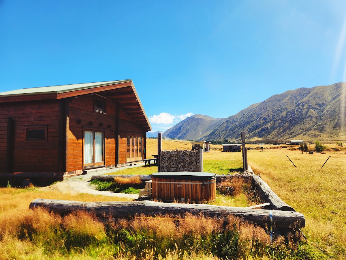 * Luxury eco-friendly cabin set on the edge of forest with stunning views of the Four Peaks of South Canterbury - with a Noon "no rush" check out * King Bed with wood fire in open plan living room * Spring-fed plunge pool * Wood-fired hot tub - $70 for one night ($100 for 2) * Stunning dark sky stargazing. Daytrips to Tekapo, Mt Cook, Mt Sunday (Lord of the Rings, * 8kms from Geraldine for cafes/restaurants/museums * BBQ & couch on the covered verandah-birdsong, native birds flying overhead.