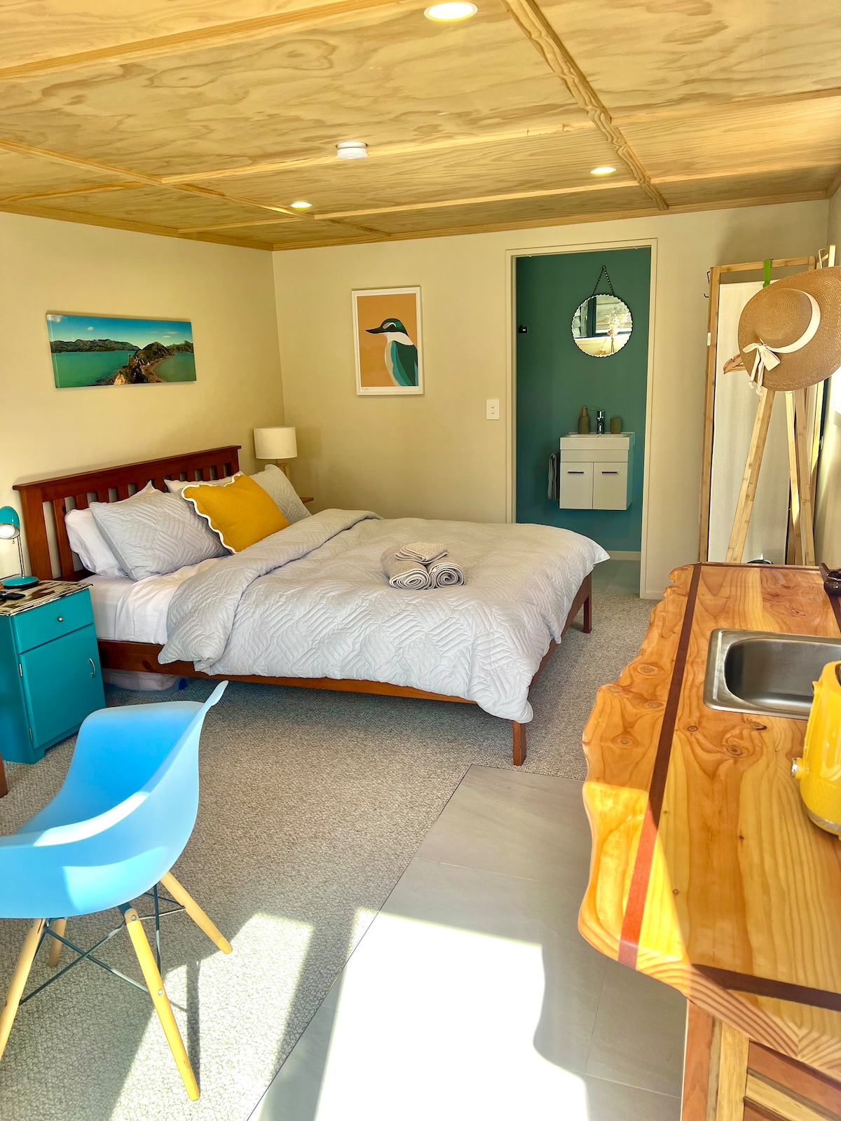Contemporary self contained modern cabin situated in a peaceful and private garden setting. It has 2 double glazed doors leading on to a deck with out door seating. Separate access way, with parking bay at side of cabin. Additional parking is available in adjoining paddock with gate through to alleyway. Cabin has starlink wifi with excellent wifi connection. The cabin is on a lifestyle block, with extensive gardens, orchard, herb garden, sheep, chickens, and hydroponic system.