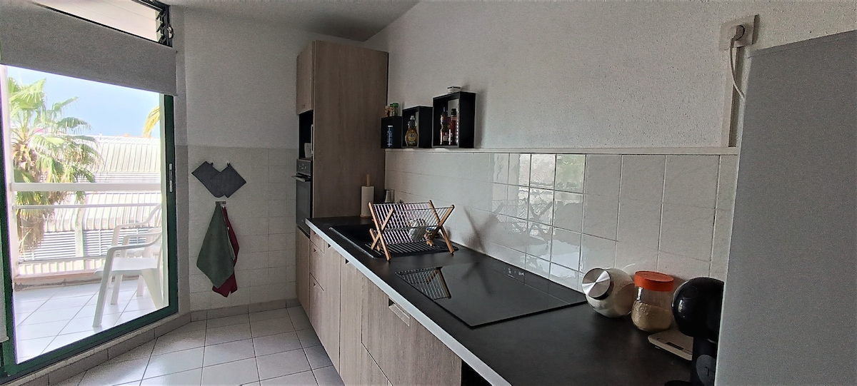 T2, tout confort. Grande pièce de vie agréable, canapé convertible. Cuisine équipée donnant sur la terrasse. Salle de douche (cabine multi-jets). Chambre climatisée, placard mural. Loggia (espace de rangement bagages, machine à laver, table & fer à repasser, Chauffe-eau thermodynamique). Terrasse aménagée.