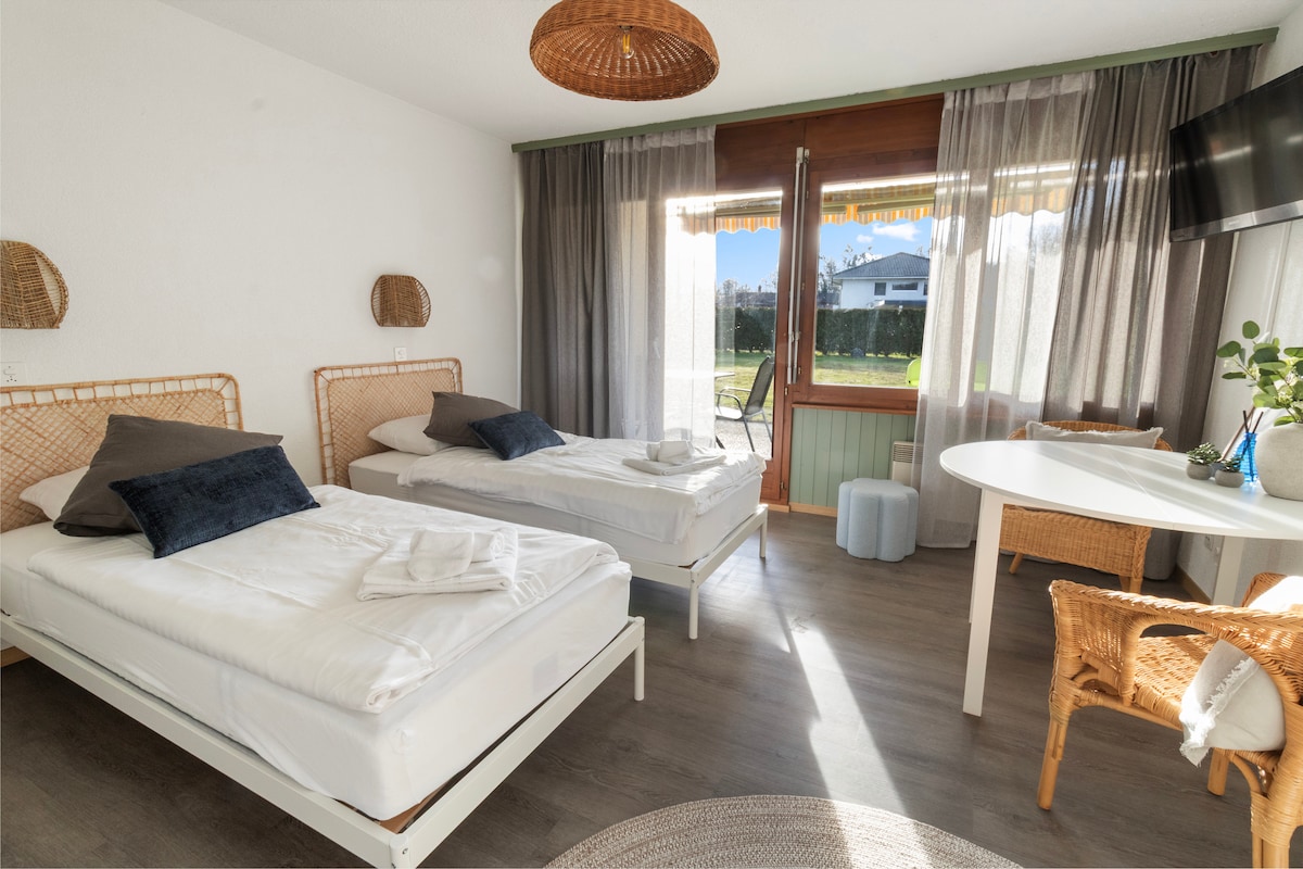 Chambre cosy et soigneusement aménagée pour 2 personnes, idéale pour une escapade à Portalban et alentours. La chambre confortable offre un véritable cocon pour se reposer après une journée au grand air. Situé dans un environnement calme, à quelques pas du lac, de la plage, de la Grande Cariçaie et des sentiers de promenade, le logement est parfait pour profiter de la nature, du bord de l’eau et d’un séjour ressourçant, en toute saison. Sa terrasse offre un moment de relaxation garantit !