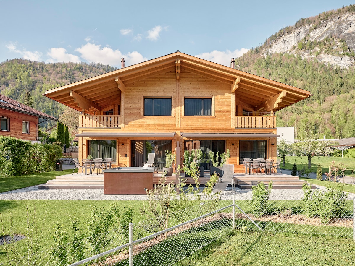 Swiss Chalet Style House over looking the Lake of Thun with a stunning view of the Bernese Mountains. It is ideally located for outdoor activities since in close proximity of mountains, lake and woods. 20 minutes walk down the hill and along the lake to the Town Centre of Thun. Boat jetty just 12 minutes walk. Unforgettable boat trips to Interlaken. Hot Tub for evening relaxation all included. Nearby Public Transport to Interlaken, Bern, Grindelwald & Gstaad. All within 20-80minutes journey.