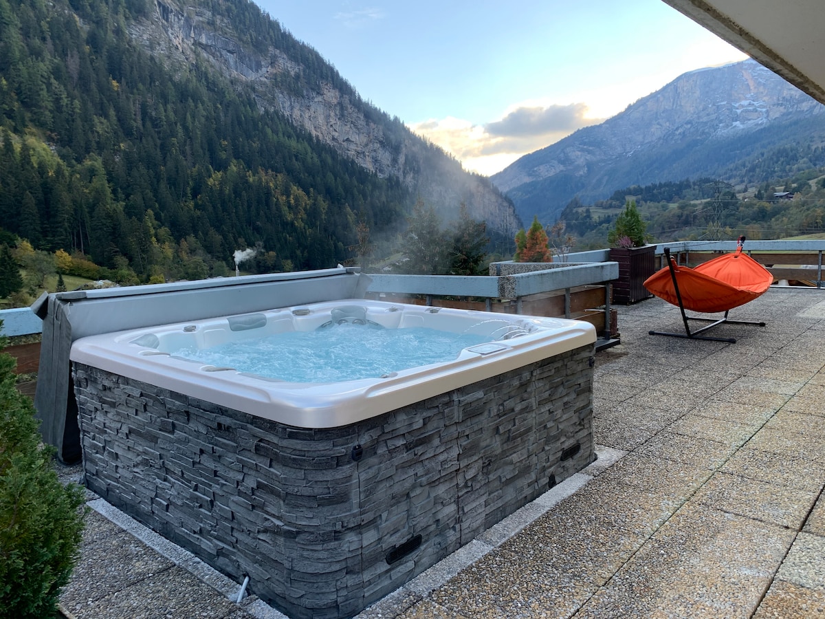 Penthouse studio with 100m2 terrace, uninterrupted views of the Alps and PRIVATE hot tub. Indoor space composed of an open living and dining room with a folding murphy bed (180cm), large screen TV, full bathroom and a cozy office. The kitchen has everything you need. Outside, the terrace and views await. An outdoor dining table, hammock and fire bowl invite you to relax. Close access to Gemmi & Torrant cable cars and thermal baths.