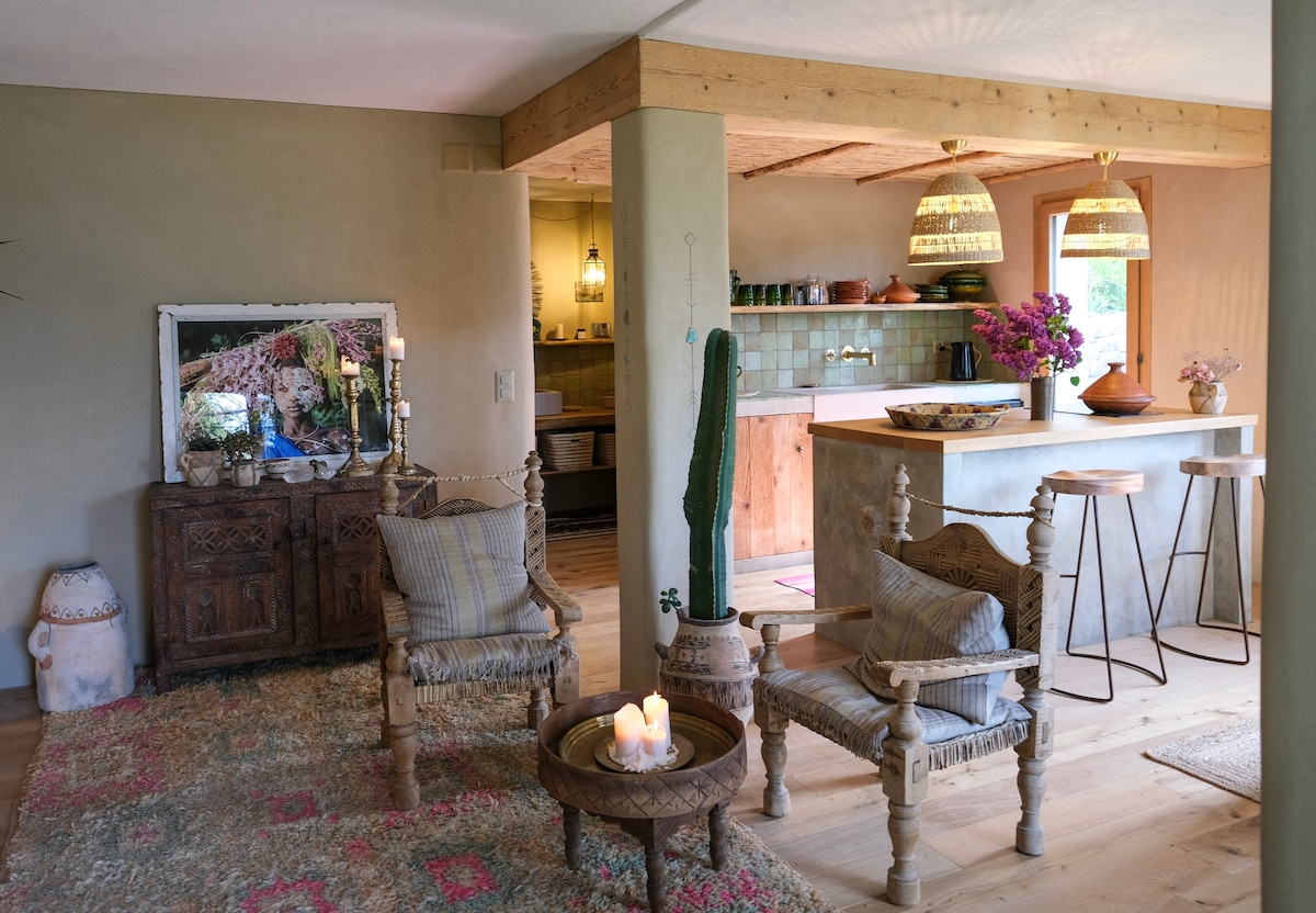 The Provenance Carriage House offers you a quirky and unique independent home ideally suited for couples/single or business travellers. Spread over 2 floors with a ground floor entrance which leads into a spacious open plan living room, dining and kitchen area. The quirky open plan bathroom with toilet, shower and washbasin and a comfortable double bedroom. The small outdoor space offers you a table and chairs and BBQ/fire pit
