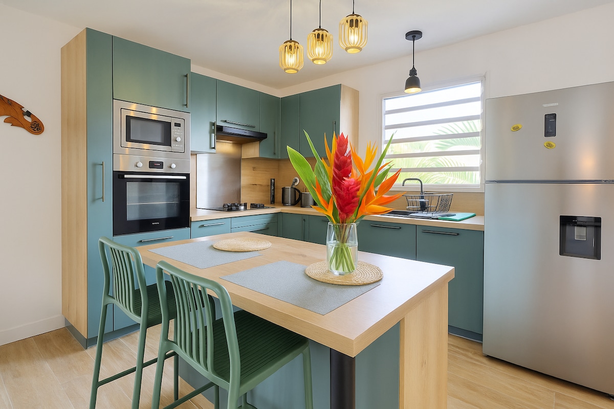 Bienvenue à L’Oasis d’Émeraude, un appartement haut de gamme aux portes de la forêt domaniale de l’Étang Saint-Paul. Ce lieu unique allie confort moderne et nature préservée pour un séjour d’exception. 🛏️ 3 chambres avec rangements 🍽️ Cuisine séparée équipée 🌬️ Clim 🌅 Grande varangue 🚗 2 places de parking Situé au 3e étage sans ascenseur, l’appartement offre calme et confort, à proximité immédiate du centre-ville, du marché forain, et des meilleurs spots de l’Ouest.