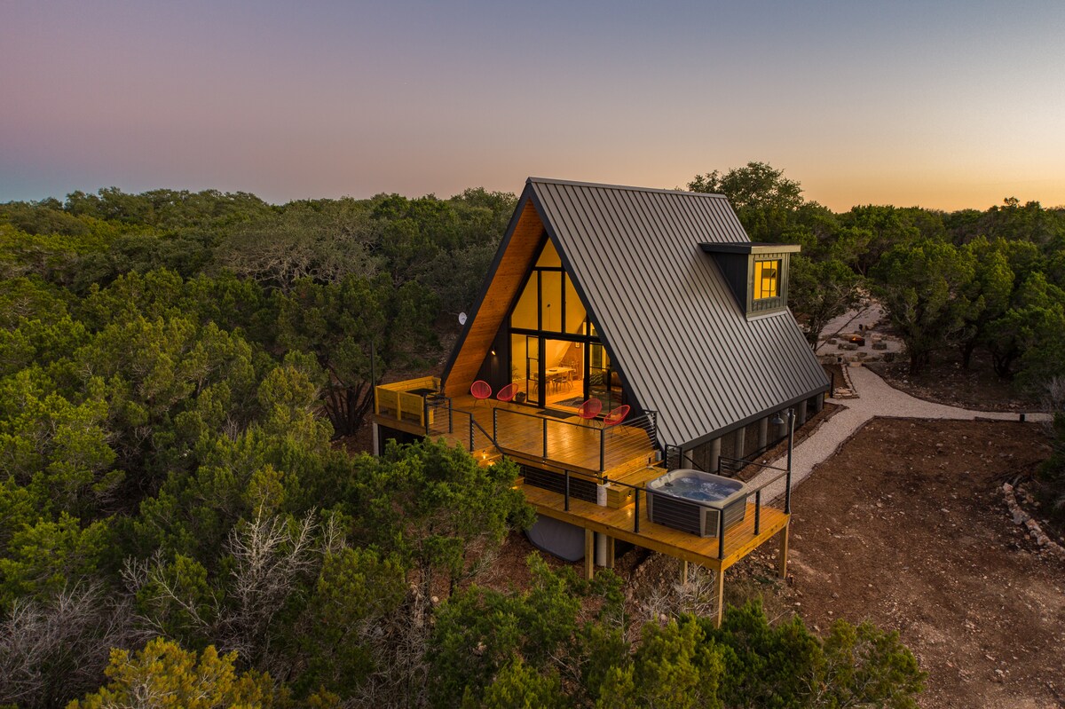 Perched high on a hill overlooking the gorgeous TX Hill Country sits the most stunning A-frame you ever did see. With a mix of mid-century style and artsy touches, this space is gorgeous. The cabin is tucked into a pocket of nature surrounded by 3 acres of oaks, elms, and junipers. The expansive front windows and raised deck provide and incredible sunset view across the hills and dark sky lighting sets the stage for breathtaking starry skies. The hot tub and outdoor shower is icing on the cake!