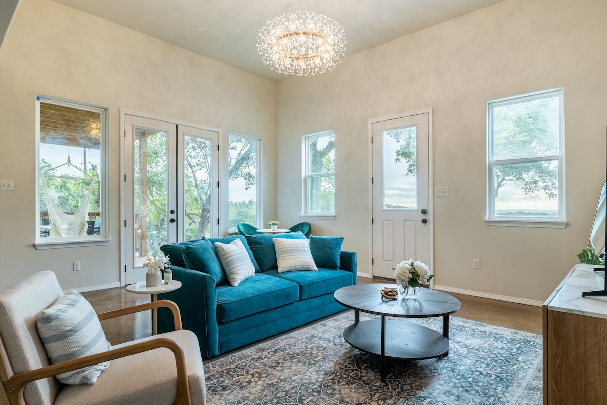 Relax all your worries away! This stylish and romantic lakeview hideaway is the perfect place to renew, recharge and enjoy picture perfect views. This unique cabin offers a spa room, ample patio decks, cozy firepit lounge area, outdoor dining, outdoor shower, BBQ, TV and game area. Property is conveniently located 2 minutes from the Lake and boat ramp#1. Five minutes from restaurants, antique shops, 10 minutes from local vineyard, 20 minutes from charming town of Gruene and New Braunfels.