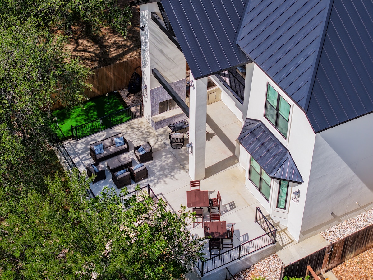 Perched among the treetops, The Lux Treehouse is a unique short-term vacation rental in Wimberley, TX, that offers 680 thread count sheets, spectacular views with romantic sunsets, a porch in the treetops for outdoor dining, a fire pit, a full kitchen, an indoor tub and shower, a private outdoor tub, and an outdoor daybed swing and lounge area. The house sleeps four (4) guests in tranquility, comfort, and luxury