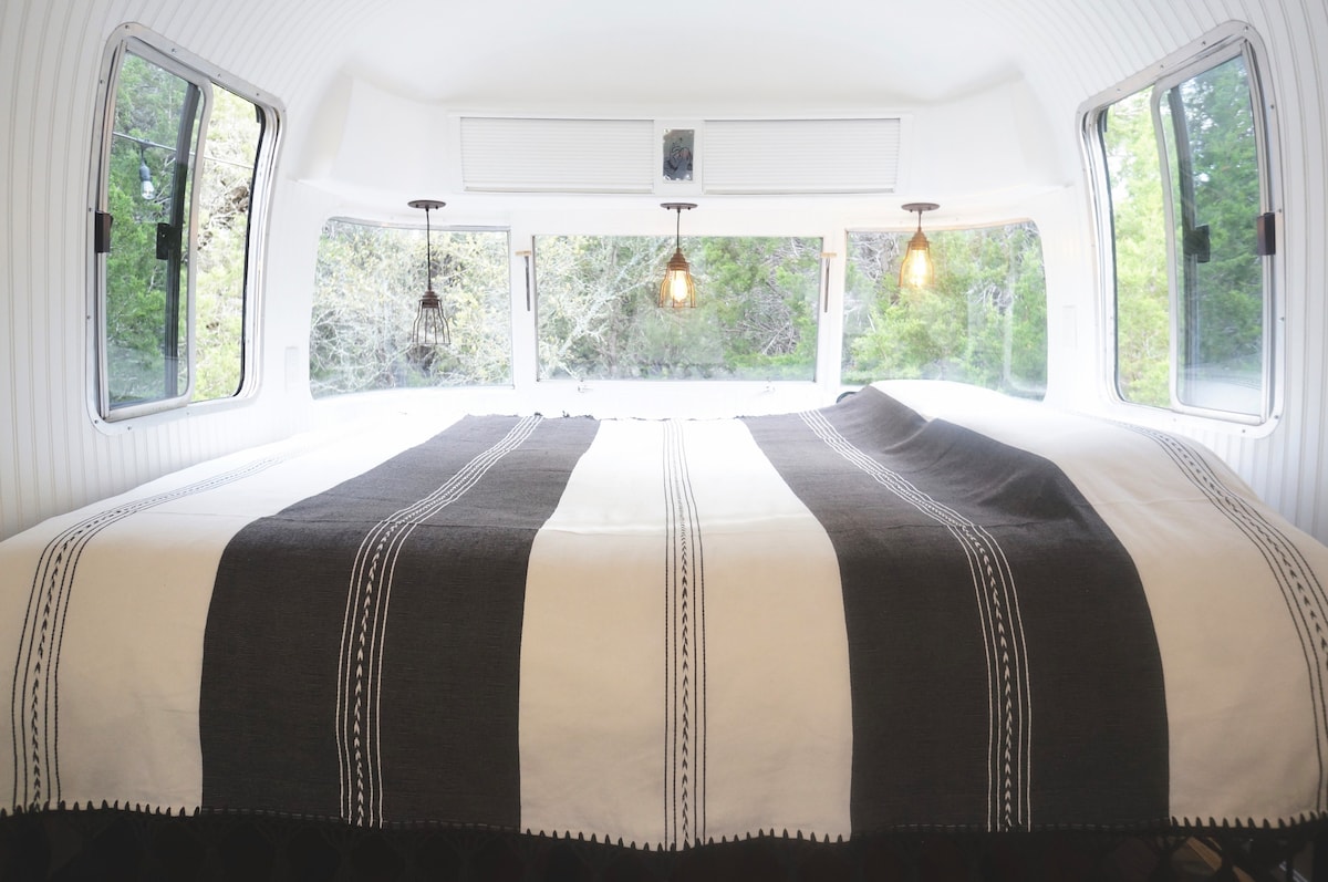 Come stay in our newly renovated 1973 Airstream trailer by the tranquil Guadalupe River in New Braunfels, TX. With room for four, it offers private river access, outdoor living space, a charcoal grill, and a TV with high-speed internet. Bring your tubes and kayaks for a fun-filled adventure down the river. Book now for an unforgettable stay!