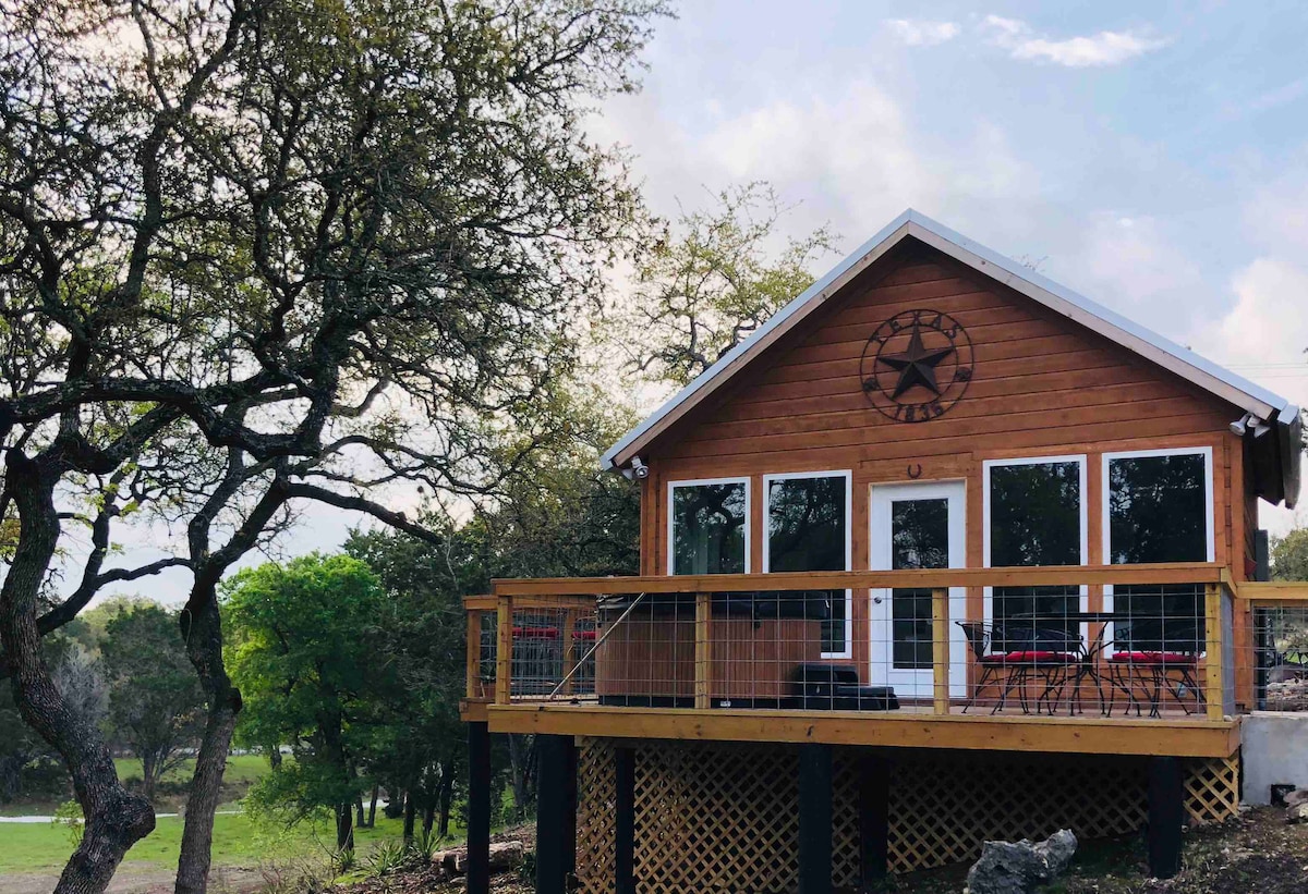 Efficiency Studio Cabin w/ private HOT TUB. Great dining & location! Cozy, country feel, w/ city conveniences. A 4 min drive to swimming, fishing & boating on Canyon Lake. Tubing? River Rd is minutes away. Concerts w/ Willie, Miranda & ZZ Top often performing nearby at White Water Amphitheater. Watch deer graze while rocking on your front porch. Gather around a nice fire at the fire pit steps from the front door. Round out your day BBQ-ing & relaxing in a hot tub-right beside the cabin!