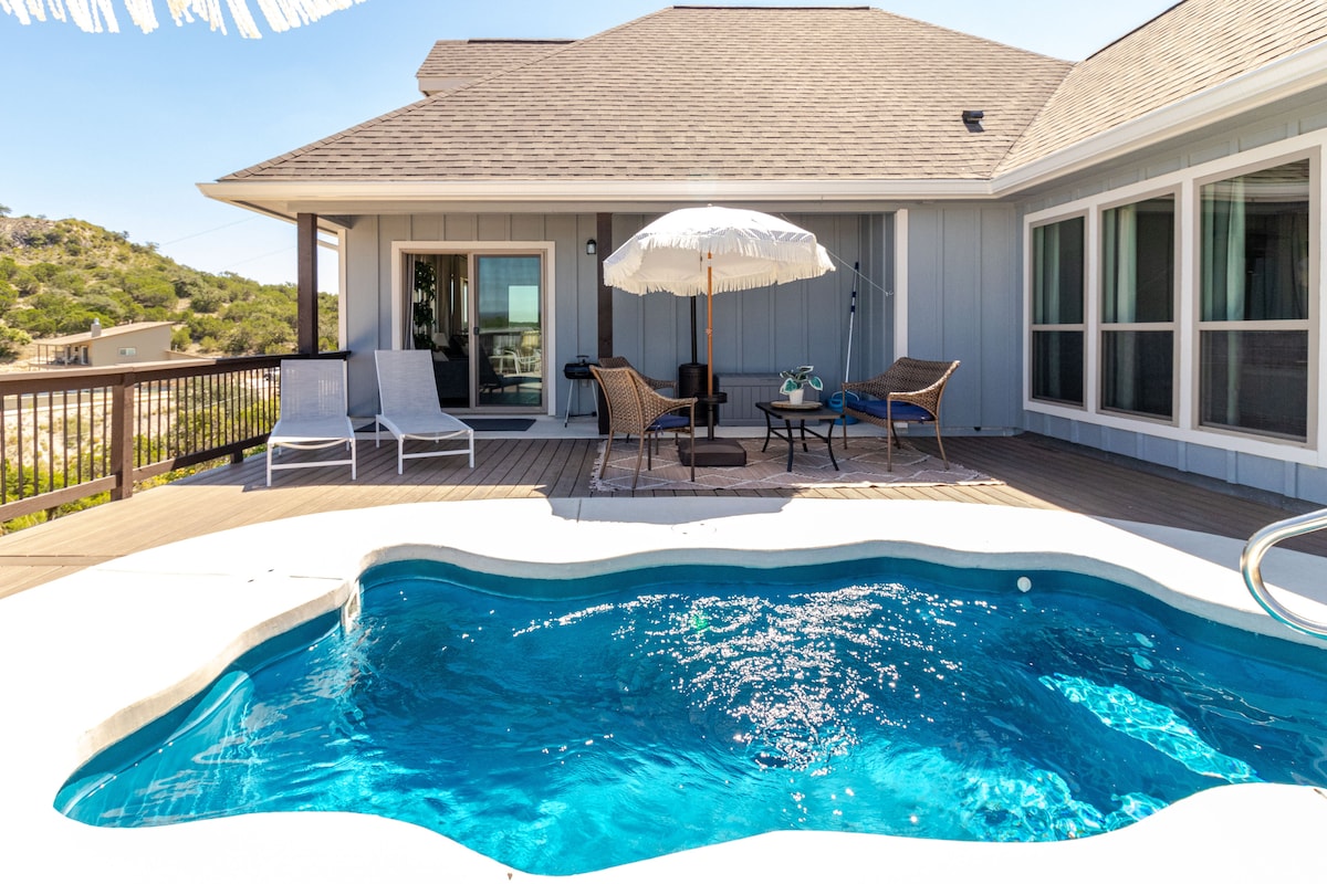 Now sleeps 6! Eden Vista is a magical lakeside retreat with sweeping views, from a cozy & stylish home with a large deck and private heated dipping pool. Bedrooms have en suite full bathrooms, plus half bath in hall. Prime location with proximity to Whitewater Amphitheater, alpine slide at Camp Fimfo, the Guadalupe River, charming downtown Gruene, hiking, wineries. Enjoy the outdoors, shopping, dining, or simply relaxing with a view at Canyon Lake!