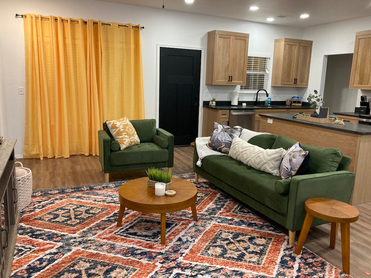 Rustic Ridge combines modern design with black and white accents throughout. The bright living room is bathed in natural light, and the fully equipped kitchen and spa-like bathroom offer ultimate comfort. The bedroom includes a queen-size bed with ample storage, while the loft upstairs features another queen bed and breathtaking views of Palo Duro Canyon. Outside, enjoy a private patio with a bistro table and grill. Located just minutes from the park entrance, it’s the perfect canyon getaway.