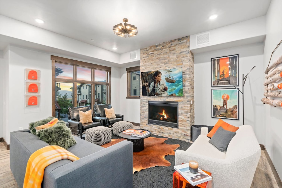 Relax in this beautifully designed two-level mountain condo at the base of Canyons. This family-friendly home has been thoughtfully designed, blending modern chic with a cozy rustic mountain feel, including vaulted ceilings with exposed wood beams and a stone fireplace. Located a short walk to the Cabriolet lift, there is no better starting point for your mountain adventures. Return home for a comfortable evening by the fire and your own private patio for grilling and taking in the views.